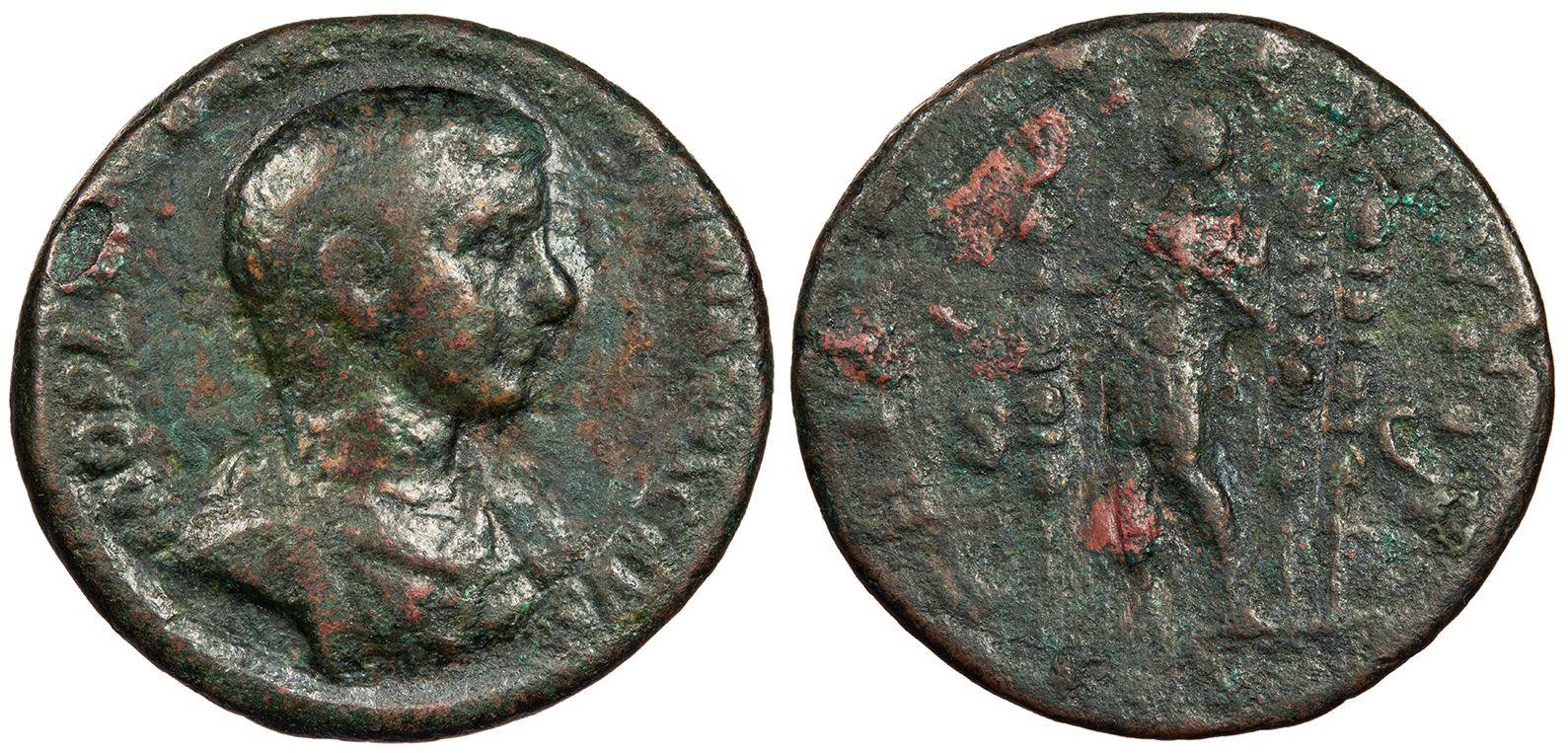 AE As 24mm. 7.21g. Rome Mint 218 A.D. (under Macrinus) Bare-headed draped bust r. M OPEL ANTONINVS DIADVMENIANVS CAES Diadumenian standing front, head r., holding standard and sceptre; on r., two standards; S C to either side. PRINC IVVENTVTIS RIC IV 212 Fine. Scarce. Dark green and red patina. Some light roughness. Obverse smoothed.