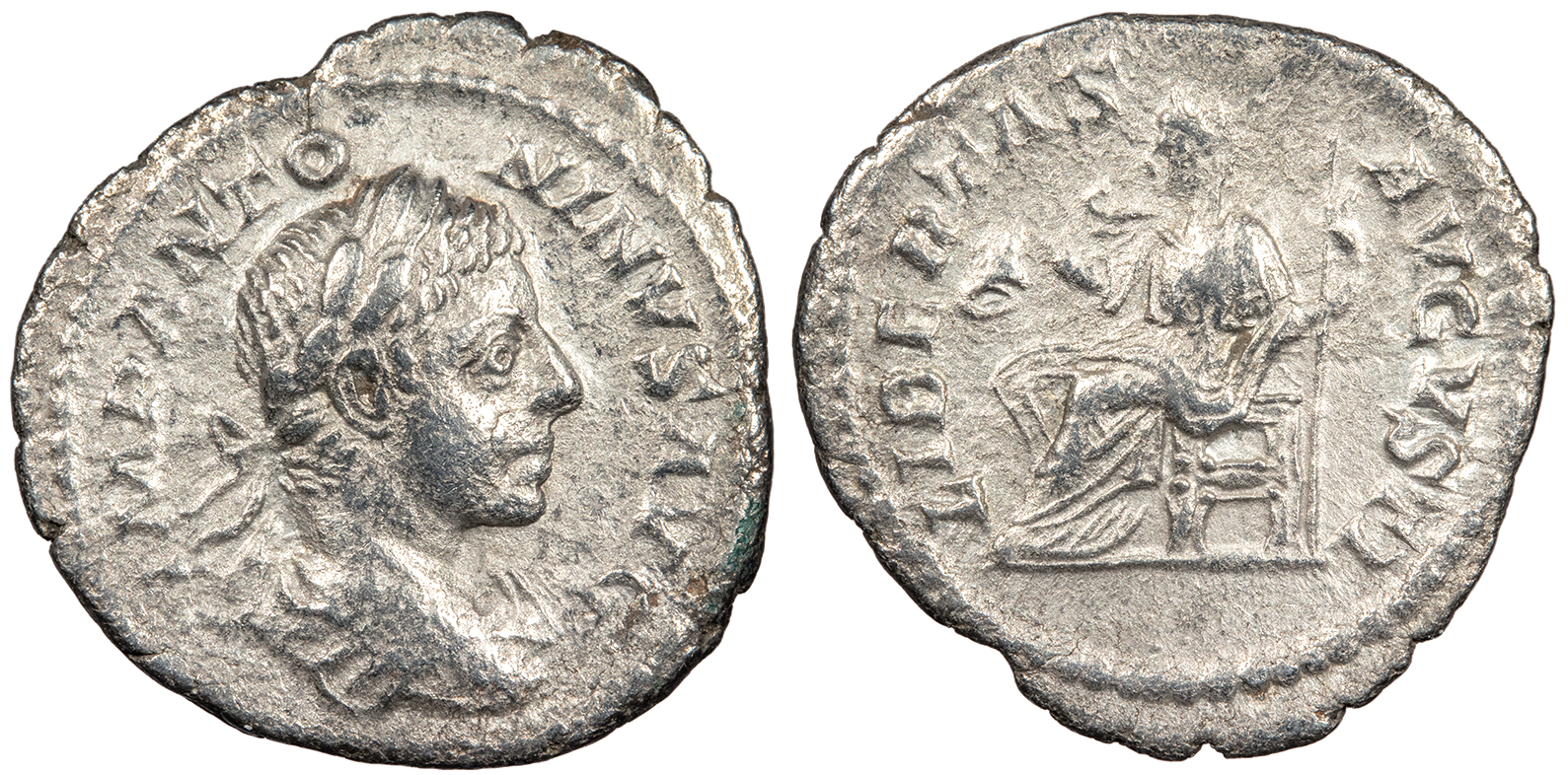 AR Denarius 20mm. 2.30g. Rome Mint 219-220 A.D. Laureate and draped bust, r. IMP ANTONINVS AVG Liberalitas seated l., holding cap and sceptre. LIBERTAS AVGVSTI RIC IV 115; RSC III 101a Good VF. Seemingly scarce. Lightly toned and lustrous. Some small scattered marks. Mild porosity.