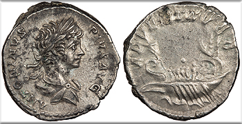 AR Denarius 18mm. 3.55g. Rome Mint 201-202 A.D. Laureate, draped and cuirassed bust, r. ANTONINVS PIVS AVG Galley l., three figures (Septimius Severus, Caracalla and Geta) seated under arch at stern. ADVENT AVGG RIC IV 120; RSC III 3 VF. Toned with much underlying lustre. Reverse die a bit worn. This type celebrates Caracalla's fifth anniversary as joint emperor with Severus, as well as the imperial family's return to Rome from the East that year, which was by ship.