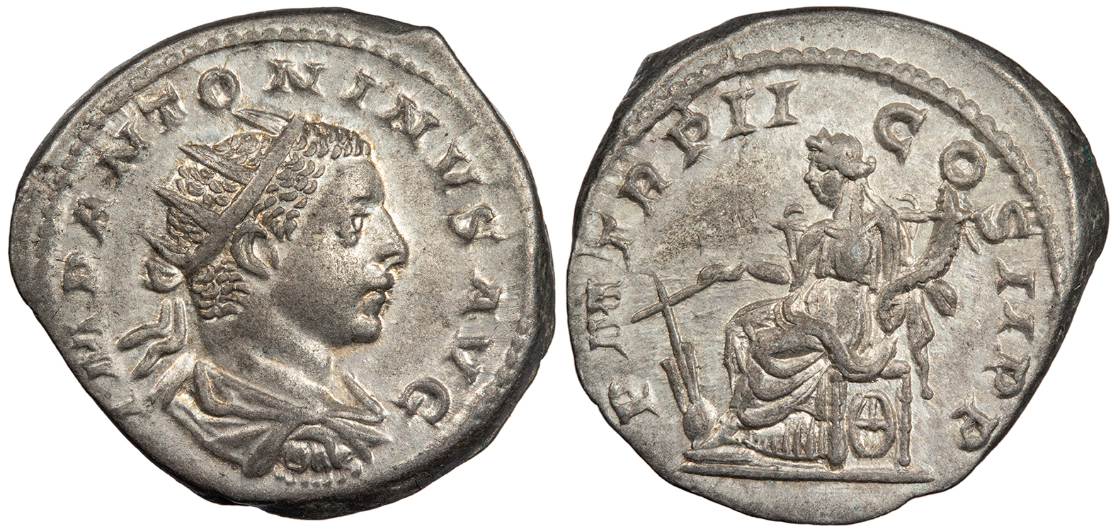 AR Antoninianus 23mm. 5.73g. Rome Mint 219 A.D. Radiate, draped and cuirassed bust, r. IMP ANTONINVS PIVS Fortuna seated l., holding rudder on globe and cornucopiae; wheel under seat. P M TR P II COS II P P RIC IV 18; RSC III 148 Near EF. Scarce. Lightly toned with bright lustre in devices. Attractive.