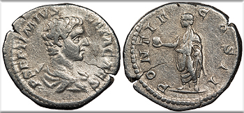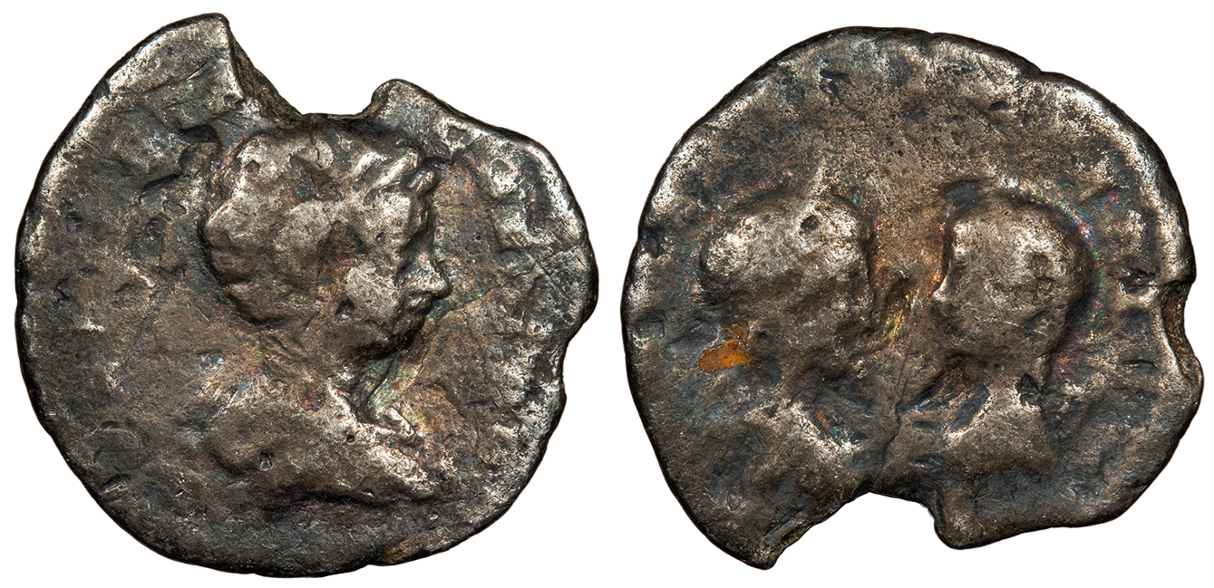 AR Denarius 18mm. 1.84g. Rome Mint 200-202 A.D. Bare-headed draped bust r. P SEPT GETA CAES PONT Busts of Septimius Severus and Caracalla, laureate, draped and cuirassed, vis-à-vis. AETERNIT IMPERI RIC IV 5; RSC III 1 About Fine. Very rare. Toned. Large chip. Some roughness and old gouges. A budget example of a very rare and popular type.