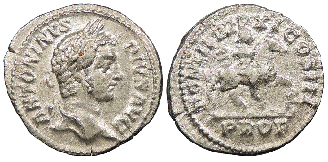 AR Denarius 20mm. 3.03g. Rome Mint 201-210 A.D. Youth's laureate head, r. ANTONINVS PIVS AVG Emperor in military dress on horseback, riding r., holding spear; enemy before him, raising r. hand; In ex.: PROF PONTIF TR P XI COS III RIC IV 108; RSC III 510 Near EF. Very lightly toned. Lustrous with good metal. Reverse die shows some wear and rusting.