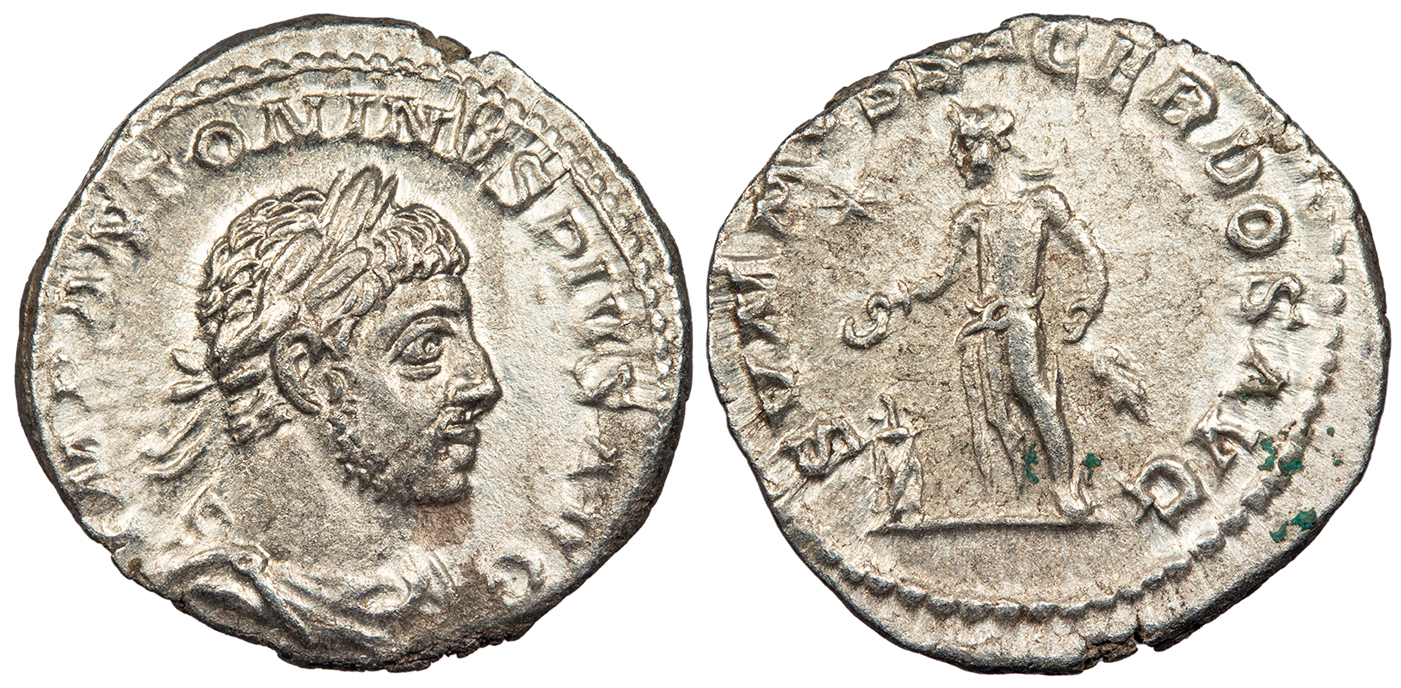 AR Denarius 19mm. 3.35g. Rome Mint 221-222 A.D. Laureate, and draped bust r., 'horn' over head. IMP ANTONINVS PIVS AVG Emperor, standing l. by altar, holding patera and club, bull behind altar, star in l. field. INVICTVS SACERDOS AVG RIC IV 88; RSC 61 EF. Lightly toned and fully lustrous. Nearly mint state.