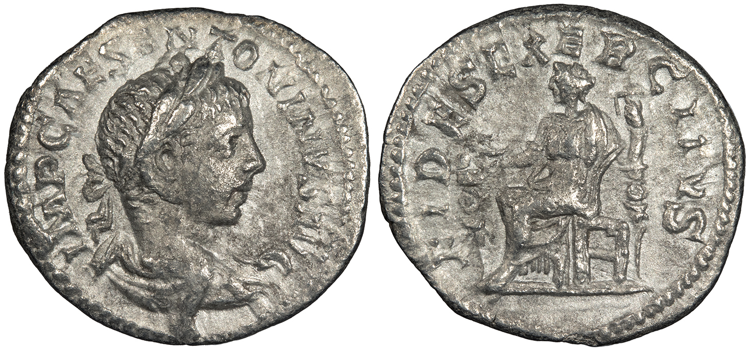 AR Denarius 20mm. 2.80g. Rome mint 219 A.D. Laureate and draped bust, r. IMP CAES ANTONINVS AVG Fides seated l., holding eagle and standard, another standard before her. FIDES EXERCITVS RIC IV 68; RSC III 30 Good VF. Lightly toned with much remaining lustre. Faint porosity.