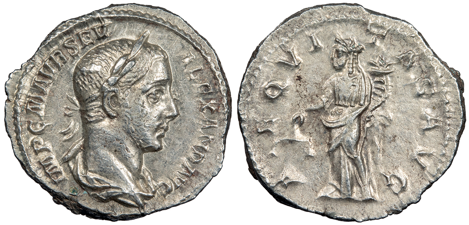 AR Denarius 20mm. 3.93g. Rome Mint 222-228 A.D. Laureate and draped bust, r. IMP C M AVR SEV ALEXAND AVG Aequitas standing l., holding scales and cornucopiae. AEQVITAS AVG RIC IV 127; RSC III 9 EF. Very lightly toned and brightly lustrous. Well struck and nearly mint state. Some porous spots, as typical. A few faint marks under magnification. Reduced from: $175
