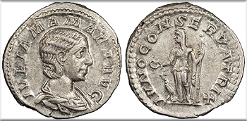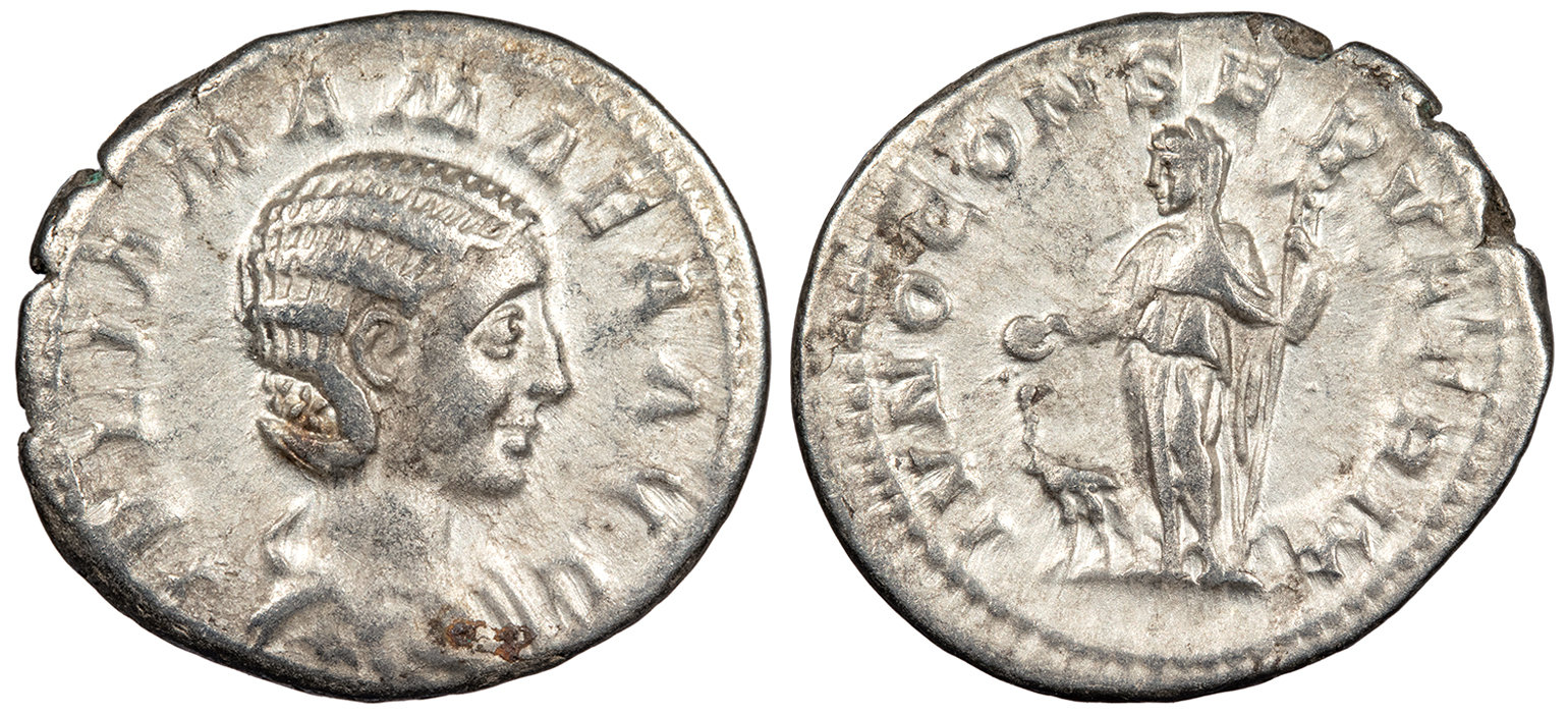 AR Denarius 20mm. 2.77g. Rome Mint 222 A.D. Draped bust, r. IVLIA MAMAEA AVG Juno, diademed and veiled, standing l., holding patera and sceptre; peacock at her feet. IVNO CONSERVATRIX RIC IV 343; RSC III 35 Near EF. Lightly toned with nearly full lustre.