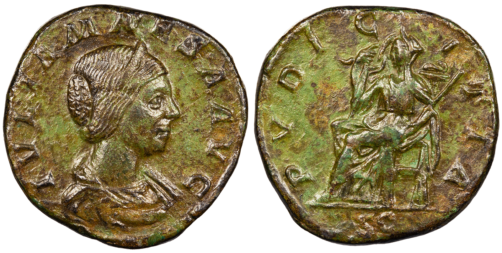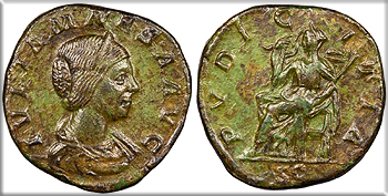 AE Sestertius 30mm. 22.70g. Rome Mint 218-220 A.D. Draped bust r., wearing stephane. IVLIA MAESA AVG Pudicitia seated l., raising hand to draw veil, holding sceptre; In ex.: SC PVDICITIA RIC IV 417 Near EF. Rare. Superb portrait. Mottled olive green patina. Fields smoothed. ex. CNR XLV.2 'Empress Collection,' with ticket. Reduced from: $1495