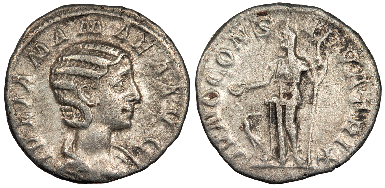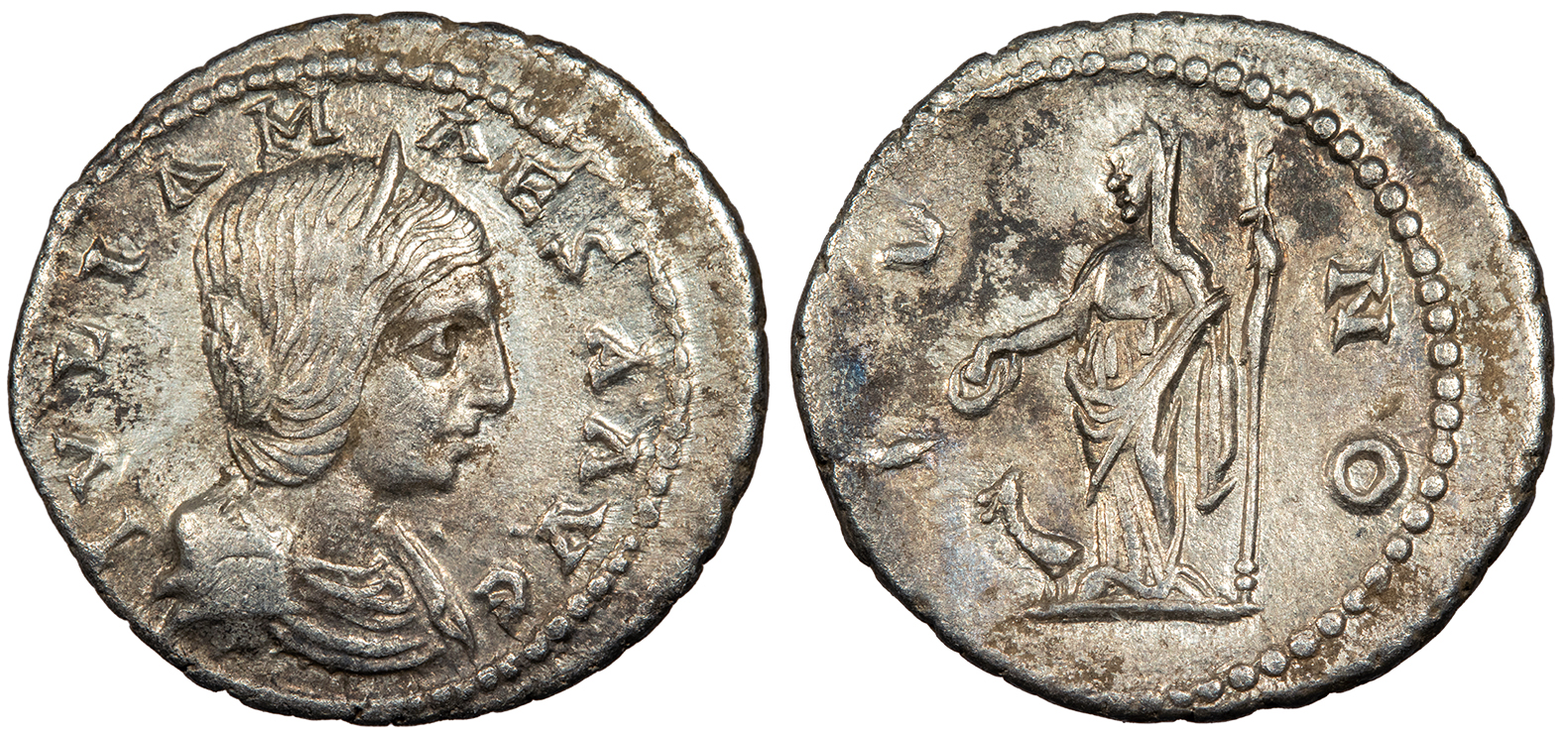 AR Denarius 18mm. 2.82g. Rome mint 222 A.D. Draped bust, r. IVLIA MAMAEA AVG Juno, veiled, standing half-left, holding patera and sceptre, peacock at feet. IVNO CONSERVATRIX RIC IV 343; RSC III 35 VF. Toned with some hints of iridescence and much lustre. Some encrustations on reverse.