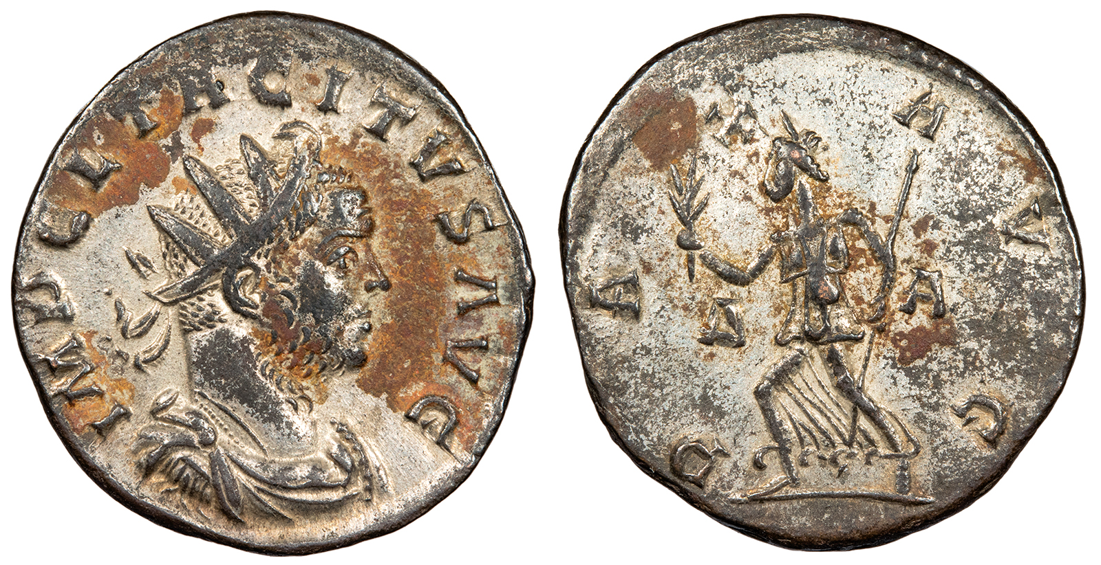 AE Antoninianus 22mm. 4.15g. Lugdunum Mint 275-276 A.D. Radiate, draped and cuirassed bust, r. IMP C L TACITVS AVG Pax walking l., holding branch and sceptre; (delta)-A across fields. PAX AVG RIC V 38 Near EF. Rare. Nearly fully silvered in fields with dark patina on high points. Some reddish adhesions. Seemingly very rare control marks for this variety with Pax walking; listed as 'common' in RIC but much rarer on the market today. Reduced from: $125