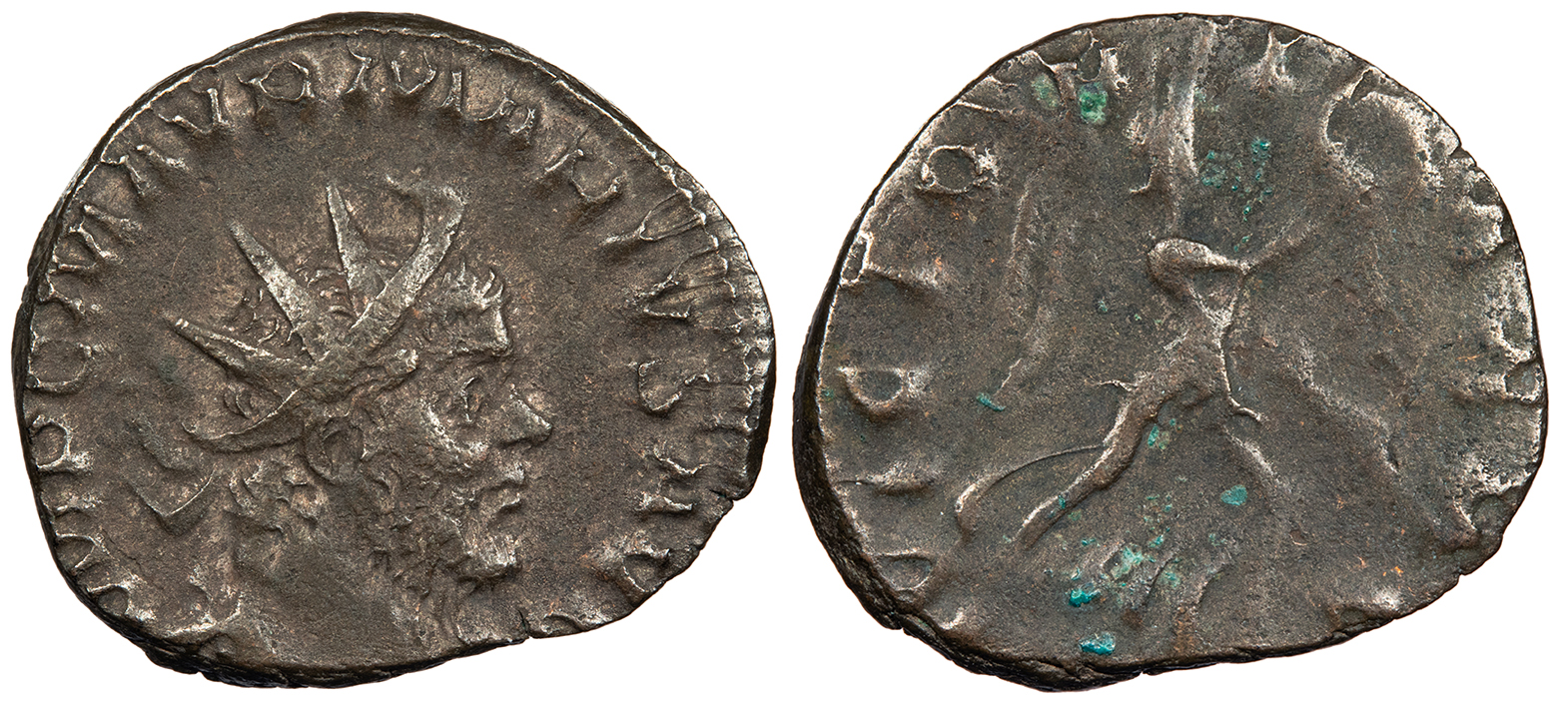 AE Antoninianus 20mm. 2.89g. Colonia Agrippinensis (Cologne) Mint mid-269 A.D. Radiate, draped and cuirassed bust, r. IMP C M AVR MARIVS AVG Victory walking r., holding wreath and palm. VICTORIA AVG RIC V 18 Good VF. Very rare. Brown patina. Good portrait detail. Typical minor porosity. Weakly struck reverse. Marius was a Romano-Gallic usurper who took control after the murder of Postumus. He was later killed by Victorinus after a reign of only two or three months.