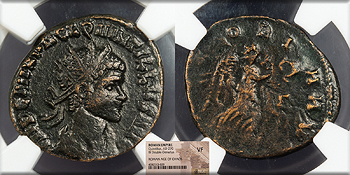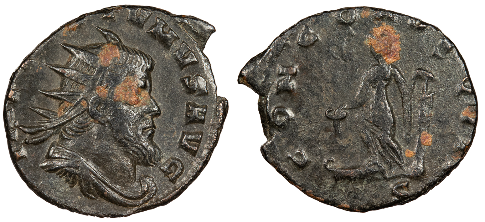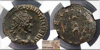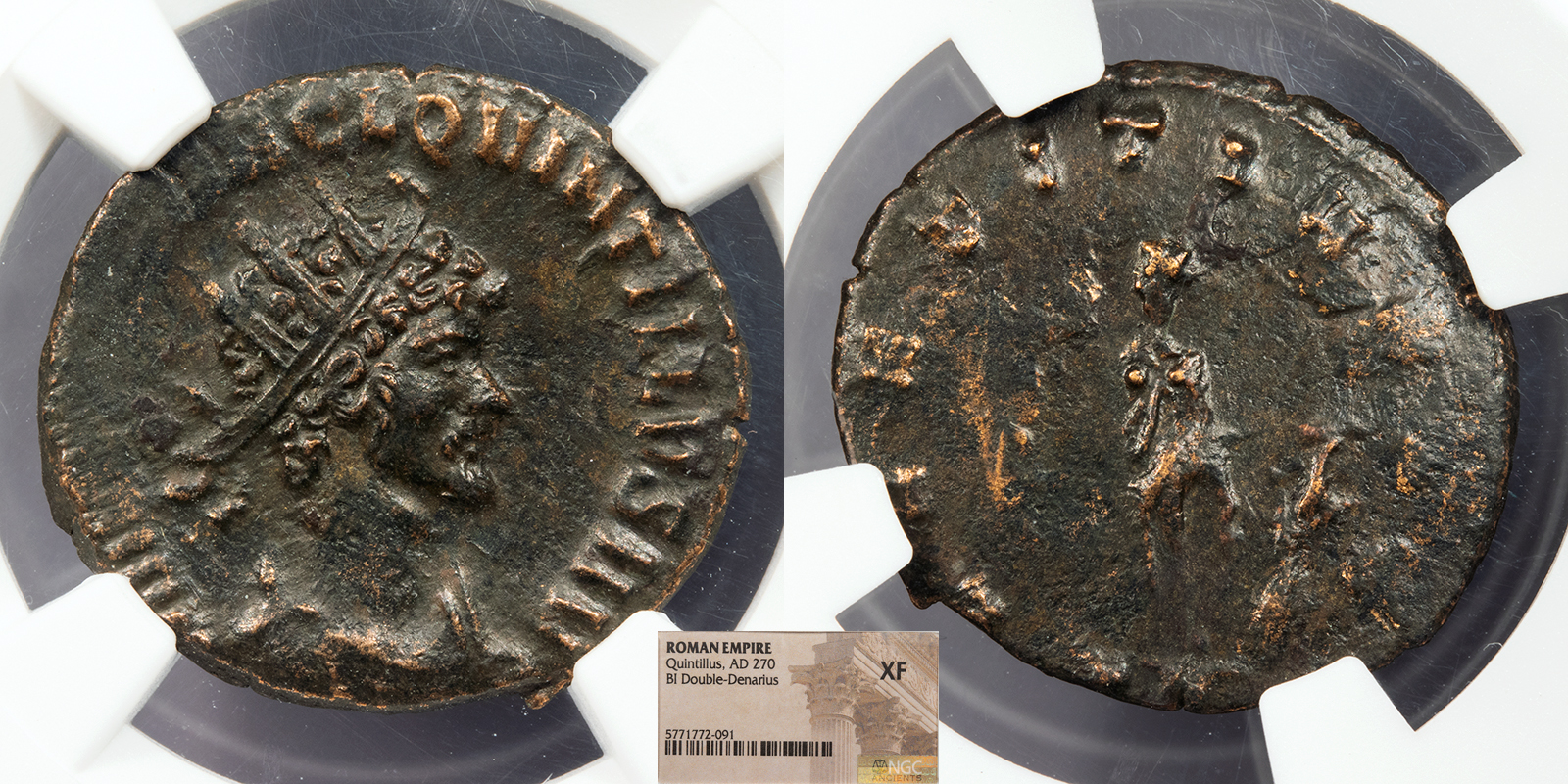 AE Antoninianus 20mm. Rome Mint 270 A.D. Radiate, draped and cuirassed bust, r. IMP C M AVR CL QVINTILLVS AVG Laetitia standing l., holding wreath and anchor on globe; In ex.: XII LAETITIA AVG RIC V 22 EF. NGC Dark brown with a few coppery high points. Excellent portrait. Weak reverse. NGC certified 'XF.' Despite the weakly struck reverse, the portrait detail is much higher than the NGC grade would imply.