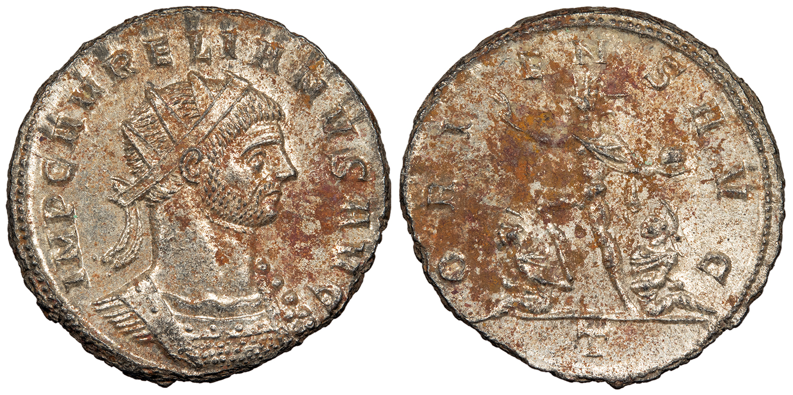 Bi Antoninianus 21mm. 3.79g. Rome or Serdica Mint 274 A.D. Radiate and cuirassed bust, r. IMP C AVRELIANVS AVG Sol walking l., r. hand raised, carrying globe, treading on captive, another captive behind; In ex.: T ORIENS AVG RIC V 61 (Rome) or 278 (Serdica) EF. Lightly toned and brightly lustrous. Sharp detail. Rusty adhesions. According to RIC, this type was produced at both Rome and Serdica.