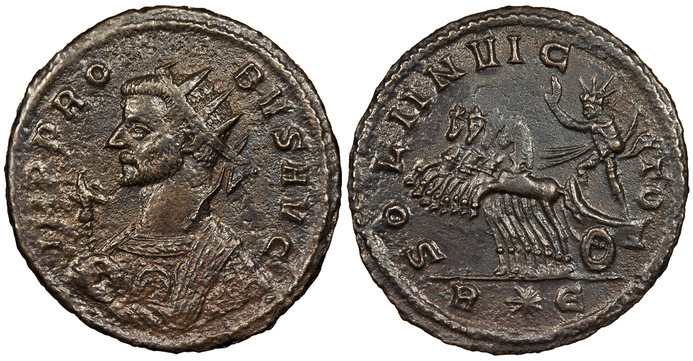 AE Antoninianus 23mm. 3.40g. Rome Mint 276-282 A.D. Radiate bust l., wearing imperial mantle, holding sceptre surmounted by eagle. IMP PROBVS AVG Sol in chariot riding l., holding globe and whip; In ex. R(star)E SOLI INVICTO RIC V 202 Good VF. Scarce. Dark brown patina. Good detail. Some minor rough spots. Reverse center a bit weak.