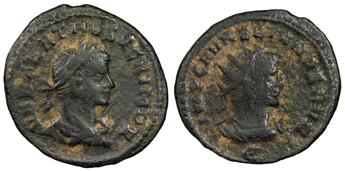 AE Antoninianus 22mm. 3.15g. Antioch Mint 270-272 A.D. Laureate, draped and cuirassed bust of Vabalathus, r. VABALATHVS V C R IM D R Radiate and cuirassed bust of Aurelian, r.; In ex.: E IMP C AVRELIANVS AVG RIC V 381 VF. Nearly black patina with some tan fill. Some light porosity. Some cleaning marks.