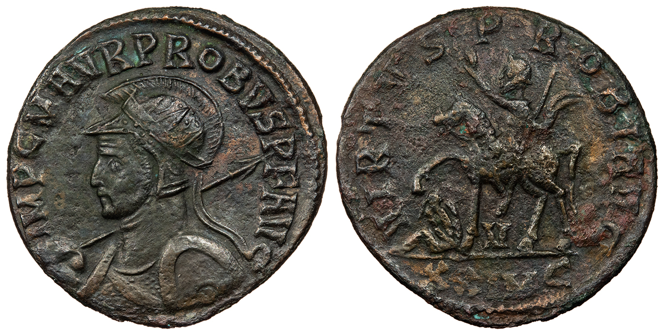 AE Antoninianus 22mm. 3.00g. Cyzicus Mint 281 A.D. Radiate, helmeted and cuirassed bust l., holding spear and shield. IMP C M AVR PROBVS P F AVG Probus, raising hand and holding sceptre, on horse trotting l.; bound captive to l.; V below; In ex.: XXIMC VIRTVS PROBI AVG RIC V 913 Near EF. Dark brown patina. Sharp portrait. Some light porosity, particularly on the reverse. Some small adhesions and light smoothing in fields.