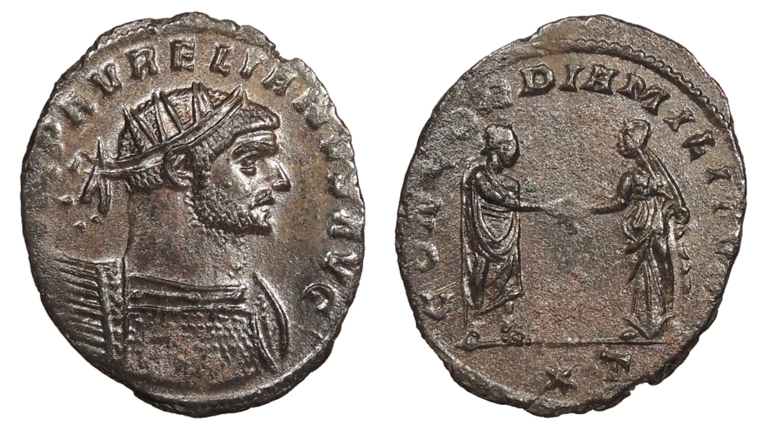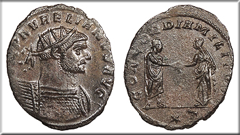 Bi Antoninianus 23mm. 3.10g. Siscia Mint 270-275 A.D. Radiate cuirassed bust r. [I]MP AVRELIANVS AVG Emperor standing r., clasping hand of Concordia; In ex.: (star) T CONCORDIA MILITVM RIC V 216 EF. Dark glossy brown patina. Sharp details. Areas of weak strike. Faint roughness.