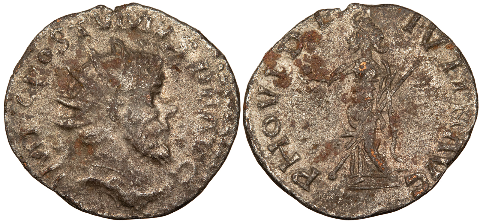 Bi 'Antoninianus' 20mm. 2.40g. Imitating Lugdunum mint Radiate, draped and cuirassed bust, r. IMP C POSTVMVS P F AVG Providentia standing l., holding globe and transverse sceptre. PHOVIDE-NTIN AVG RIC V 80 (for prototype) Good VF. Medium toning with much lustrous silvering remaining. Nicely styled contemporary counterfeit. Weak obverse strike. Some coppery spots and slight roughness. While most likely a 'barbarous radiate' contemporary imitation, this example is of such good style that there could be a chance that it is an official issue, owing its crude manufacture and reverse spelling errors to declining mint conditions during Postumus' deteriorating reign. An interesting piece.