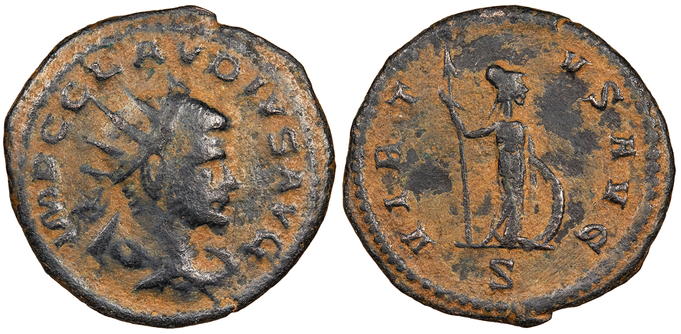 AE Antoninianus 21mm. 3.10g. Antioch Mint 268-271 A.D. Radiate draped bust r. IMP C CLAVDIVS AVG Minerva standing r., resting on shield and holding spear; In ex.: S VIRTVS AVG RIC V 225 Good Fine. Black patina with attractive red earthen fill.