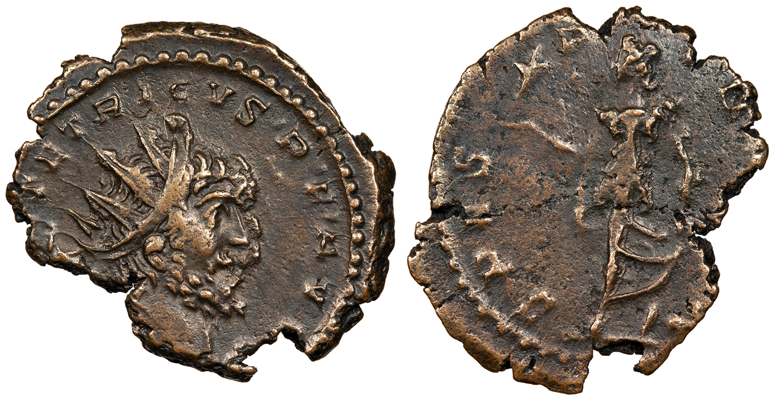 AE Antoninianus 20mm. 2.50g. Colonia Agrippinensis (Cologne) Mint 272-273 A.D. Radiate, draped and cuirassed bust, r. [IMP C] TETRICVS P F AV[G] Spes standing l., holding flower and raising robe. SPES P[V]B[LICA] RIC V 136 VF. Brown patina. Hints of lustre on obverse. Nicely styled. Ragged flan. Worn reverse die. Light porosity on reverse. This unusual example is not broken nor underweight, but was simply improperly produced. The finely styled obverse die belies the otherwise poor manufacture. In conjuction with the worn reverse die and obverse die chipping (at the facing edge of the bust), the ragged flan is indicative of the declining standards at Gallic mints after the death of Postumus.