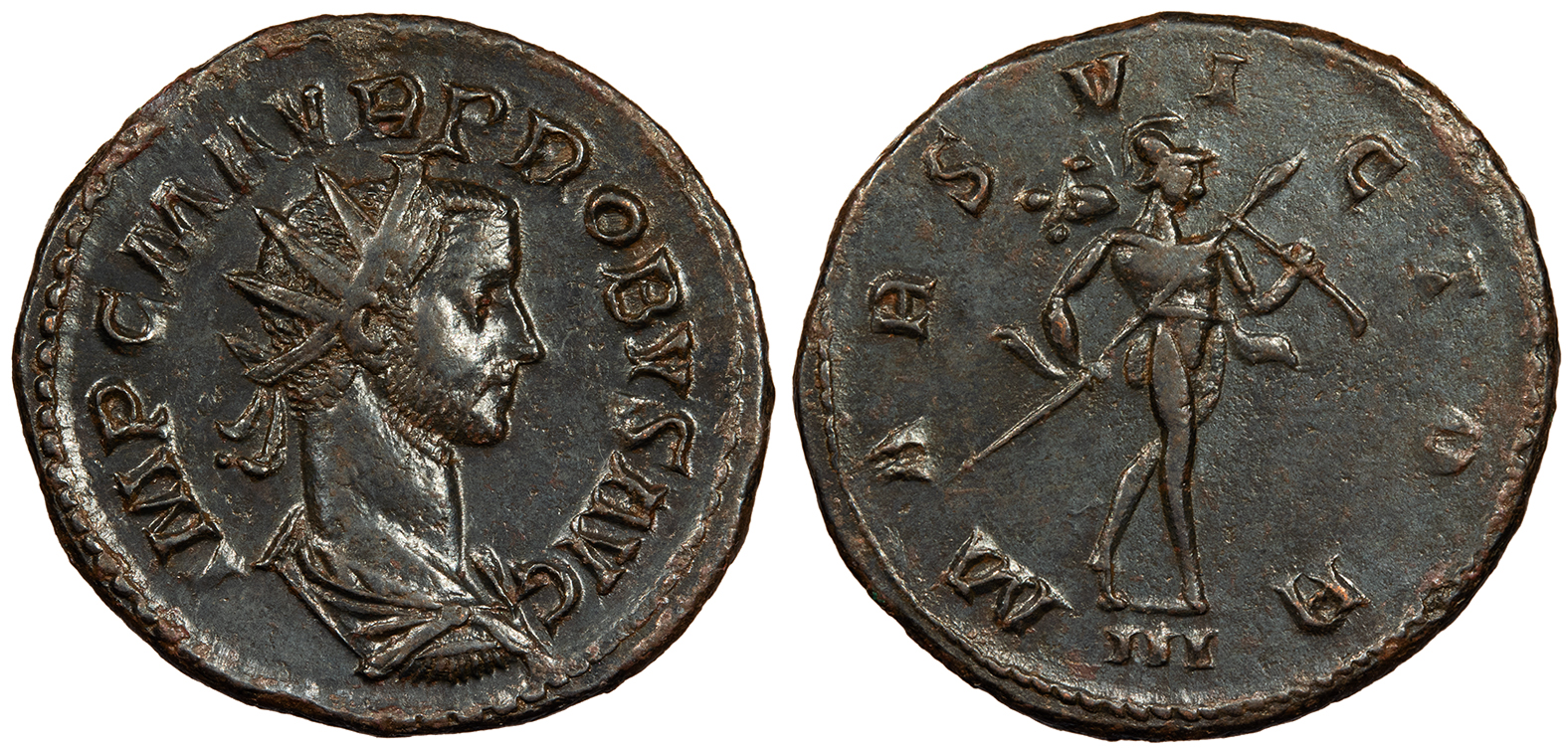 AE Antoninianus 23mm. 4.60g. Lugdunum Mint 277-278 A.D. Radiate and cuirassed bust, r. IMP C M AVR PROBVS AVG Mars walking r., holding spear and trophy; In ex.: III MARS VICTOR RIC V 83 EF. Dark gray-brown patina. Bright lustrous fields. Nice. Reverse legend weak.