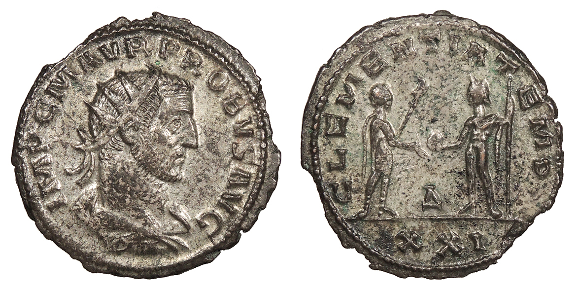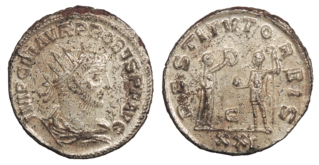 Bi Antoninianus 21mm. 3.60g. Antioch Mint 276-282 A.D. Radiate, draped and cuirassed bust, r. IMP C M AVR PROBVS P F AVG Female standing r., presenting wreath to emperor standing l., holding globe and spear; E(delta) in field between; In ex.: XXI RESTITVT OR[BIS] RIC V 925 EF. Extensive lustrous silvering. Good portrait detail. Some patchiness on reverse. Some trace porosity.