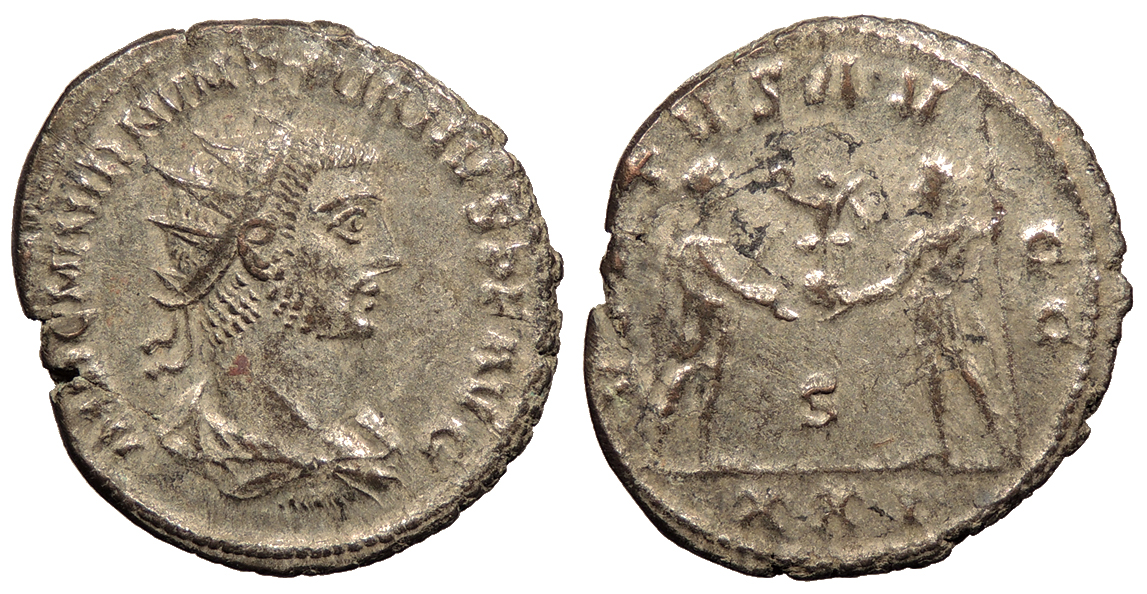 AE Antoninianus 22mm. 4.00g. Antioch Mint 283-284 A.D. Radiate, draped and cuirassed bust, r. IMP C M AVR NVMERIANVS P F AVG Emperor standing r., holding sceptre and receiving Victory on globe from Jupiter standing l., holding sceptre; S in field between; In ex.: XXI VIRTVS AVGG RIC V 466 Near EF. Nearly full lustrous silvering. Some minor flan flaws. Tiny adhesions.