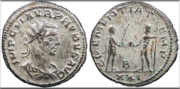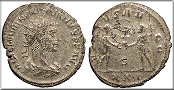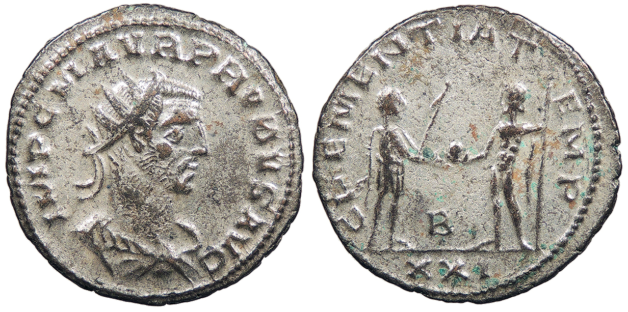 Bi Antoninianus 23mm. 3.91g. Siscia Mint 281 A.D. Radiate, draped and cuirassed bust, r. IMP C M AVR PROBVS AVG Emperor standing r., clasping hand of Concordia; B between; In ex.: XXI CONCORD MILIT RIC V 651 EF. Gray toning with much lustrous silvering remaining. Sharp. Typical light porosity.