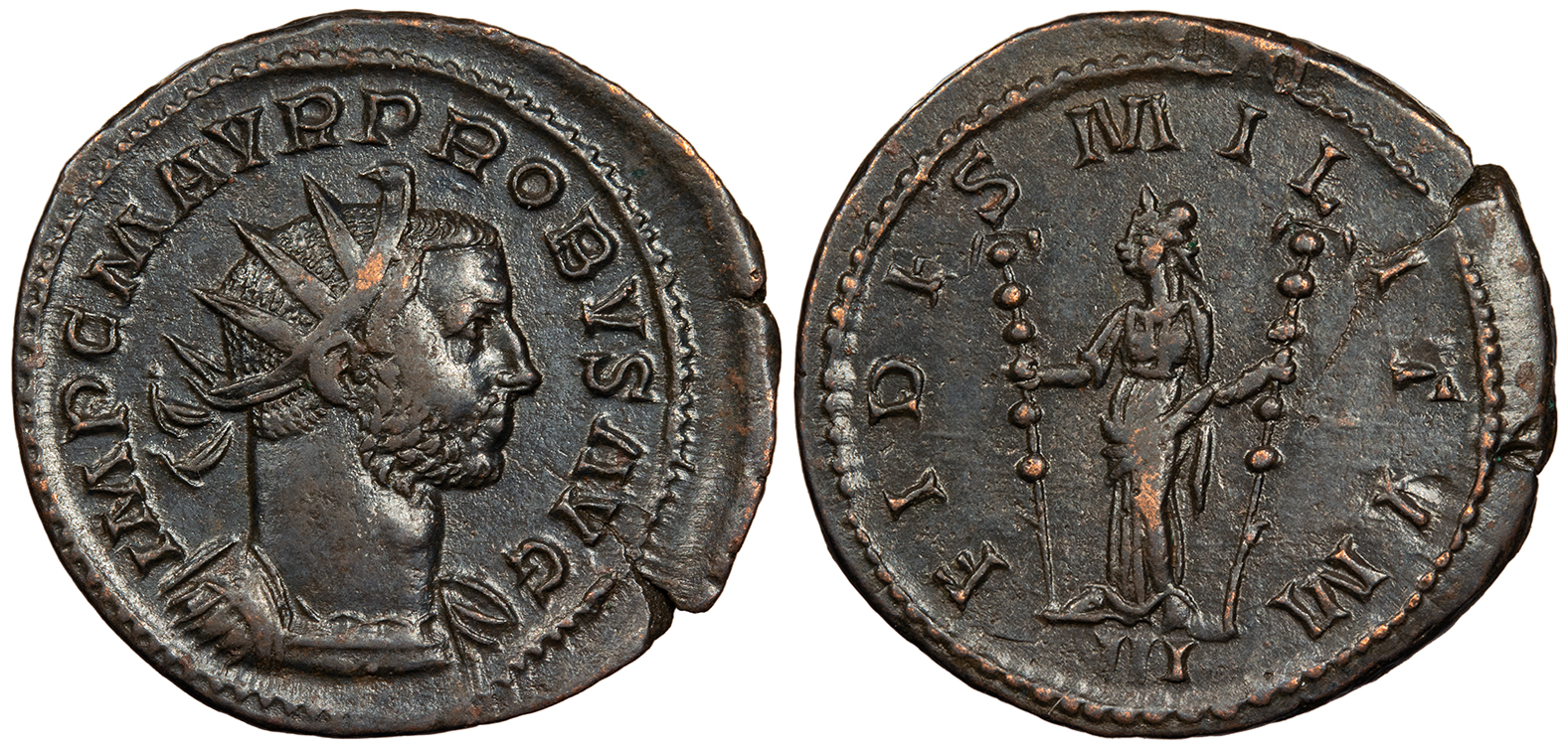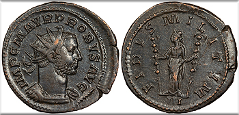 AE Antoninianus 23mm. 3.20g. Lugdunum Mint 278-279 A.D. Radiate and cuirassed bust, r. IMP C M AVR PROBVS AVG Fides standing l., holding two ensigns; In ex.: III FIDES MILITVM RIC V 79 EF. Dark gray-brown patina with lustrous fields. Good detail. Thin flan crack.