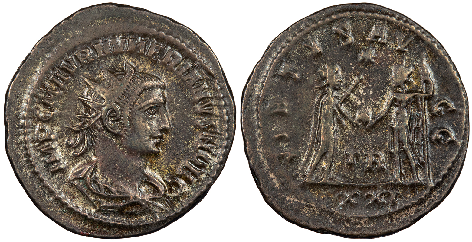 AE Antoninianus 23mm. 4.30g. Ticinum Mint 276 A.D. Radiate and cuirassed bust, r. IMP C M AVR PROBVS AVG Emperor and Concordia clasping hands; In ex.: PXXT CONCORD MILIT RIC V 332 EF. Dark brown patina with glossy, lustrous fields and traces of silvering. Some coppery high points. Struck with worn and damaged reverse die.