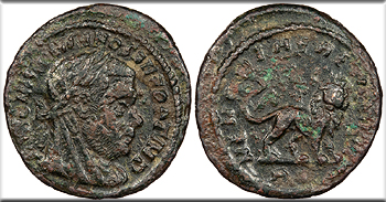 AE 1/4 Follis 16mm. 2.07g. Rome Mint 317-318 A.D. (struck under Constantine I) Laureate and veiled head, r. DIVO MAXIMIANO SEN FORT IMP Lion standing r., head facing, tail high; In ex.: R[?] MEMORIAE AETERNAE RIC VII 123 var. (lion facing r.) Good VF. Rare lion variety. Dark brown patina. Good detail despite issues. Some lightly rough spots. An unusual and seemingly rare variety in which the lion is not advancing right but instead is standing right with head facing. Not in RIC as such; we could only find one other example. The officina letter is obscured, but all are listed as rarity R2 or higher.