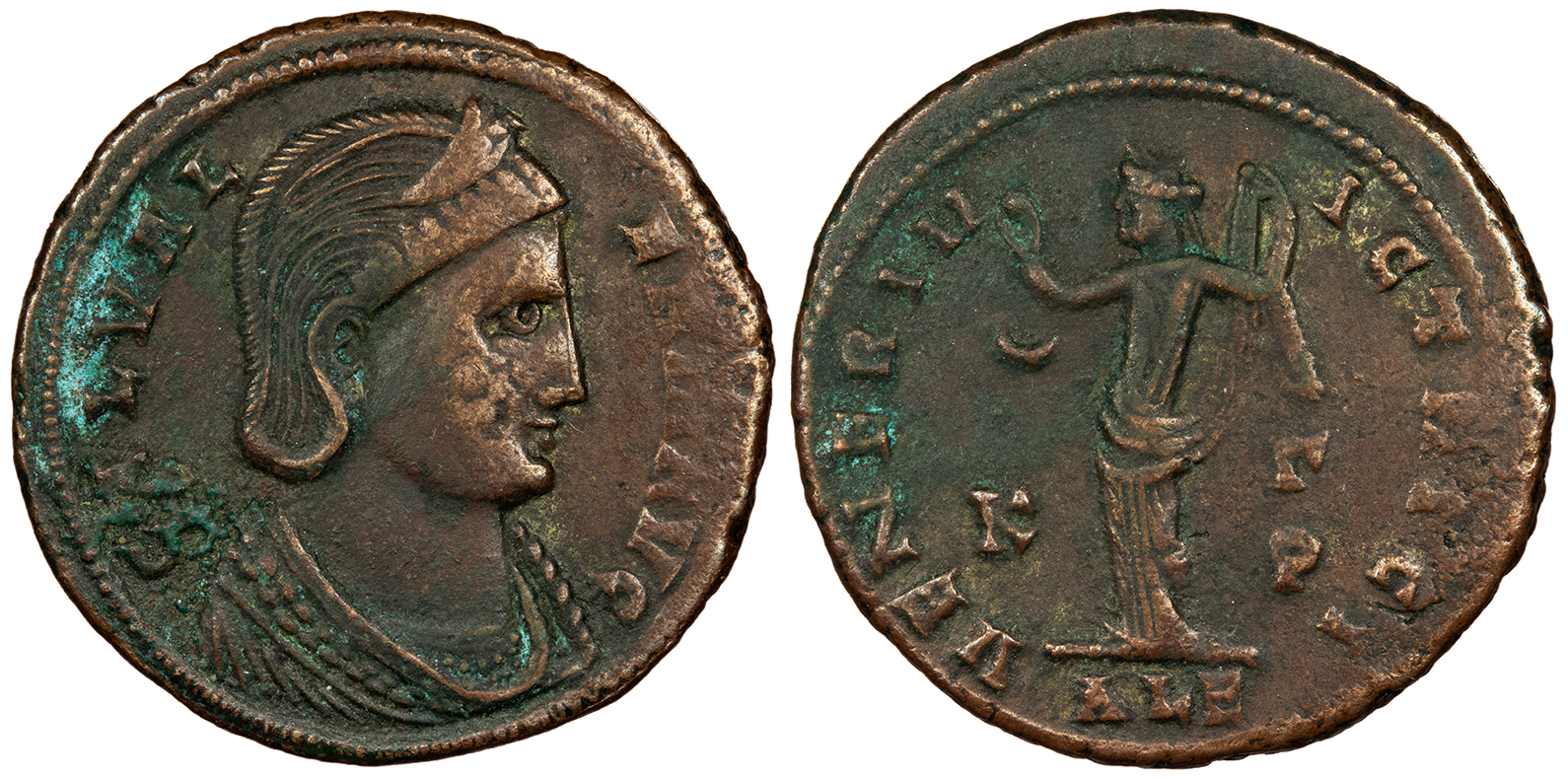 AE Follis 26mm. 3.40g. Heraclea Mint 311 A.D. Diademed and draped bust, r. GAL VALERIA AVG Venus standing facing, head l., r. holding up apple, l. raising drapery over shoulder; star in l. field, crescent in r.; In ex.: HT(gamma) VENERI V-ICTRICI cf. RIC VI 63 Fine. Unusual weight, not listed in RIC. We could not find another example. Brown patina. Old dent on bust. Small ancient bend on edge, resulting in flan splits. Unlisted in RIC. This example is of an unusually light weight; folles of this weight standard were not struck at Heraclea until 312 A.D., a year after the death of Galerius. A new 3.5g-4.5g follis weight standard was introduced by Licinius, Maximinus, and Constantine in 311-312, but these control marks were only used at Heraclea in 311 while the new weight standard wasn't put into use there until 312, according to RIC.