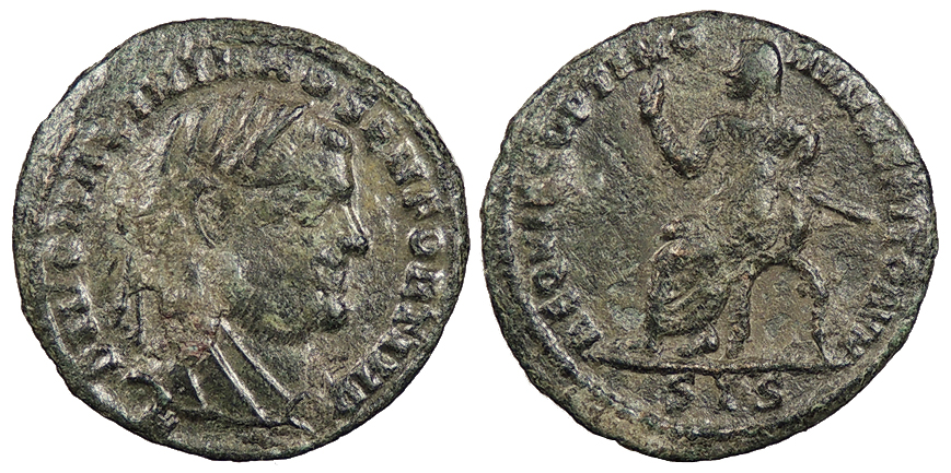 AE Half Follis 16mm. 1.13g. Siscia Mint Died 310 A.D. Laureate, veiled head, r. DIVO MAXIMIANO SEN FORT IMP Emperor seated l. in curule chair, raising r. hand, holding sceptre; In ex.: SIS REQVIES OPTIMO-RVM MERITORVM RIC VII 41 VF. Fairly rare. Gray-green patina. Light roughness and adhesions. Listed as ‘R3’ in RIC, though certainly not quite that scarce today. A budget example of a scarce issue.