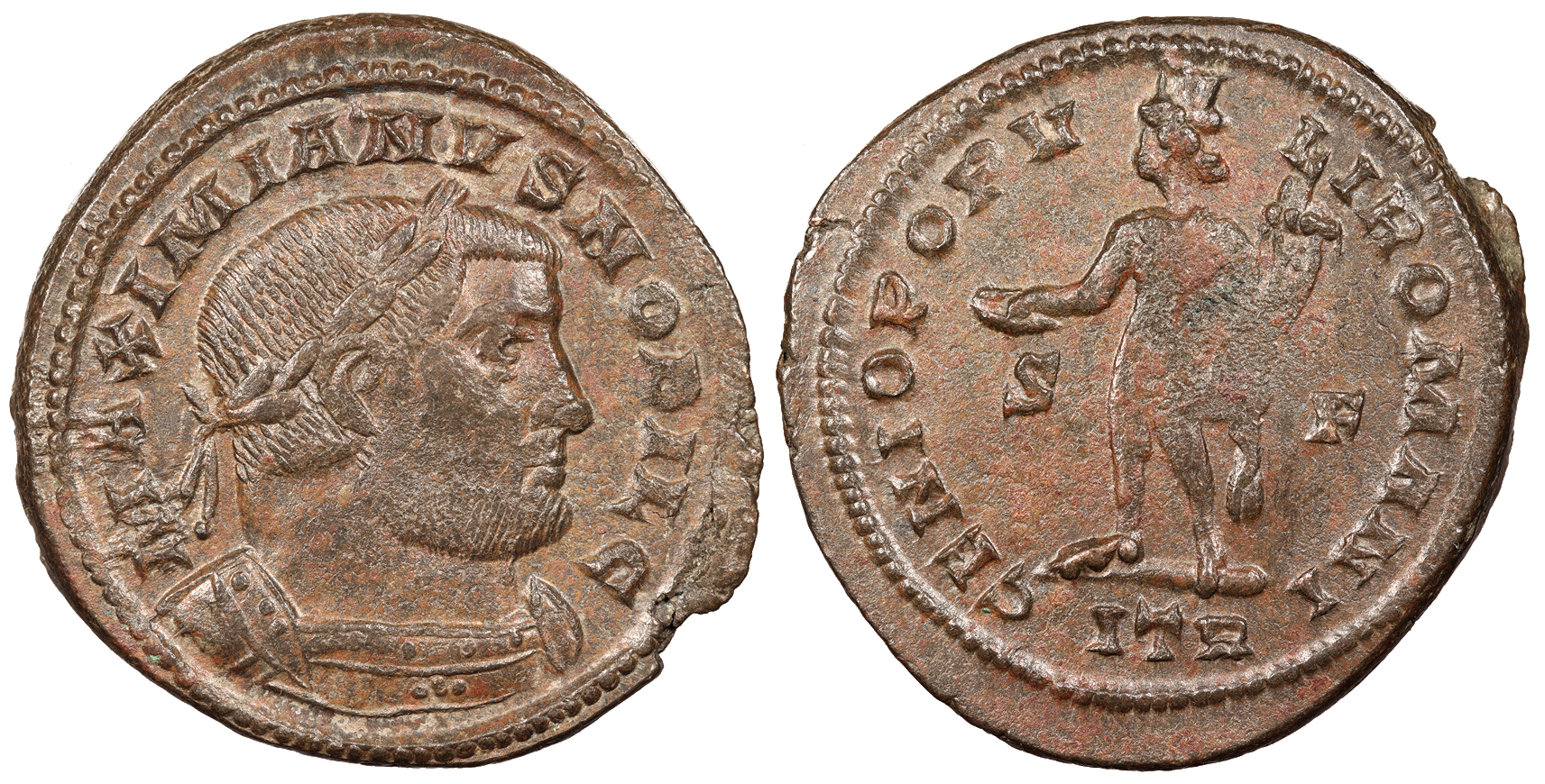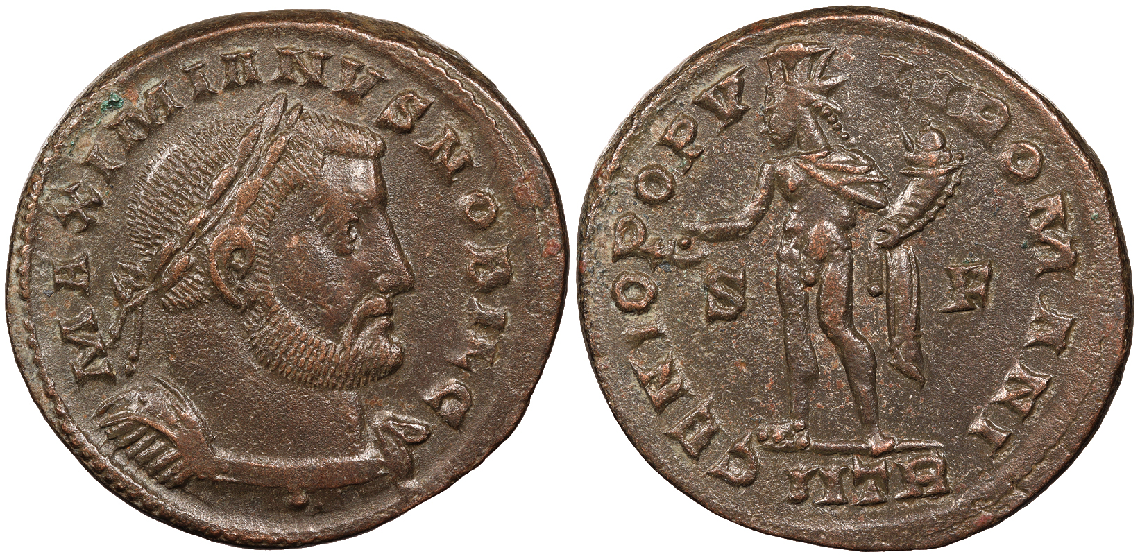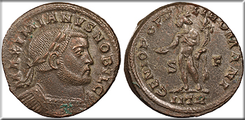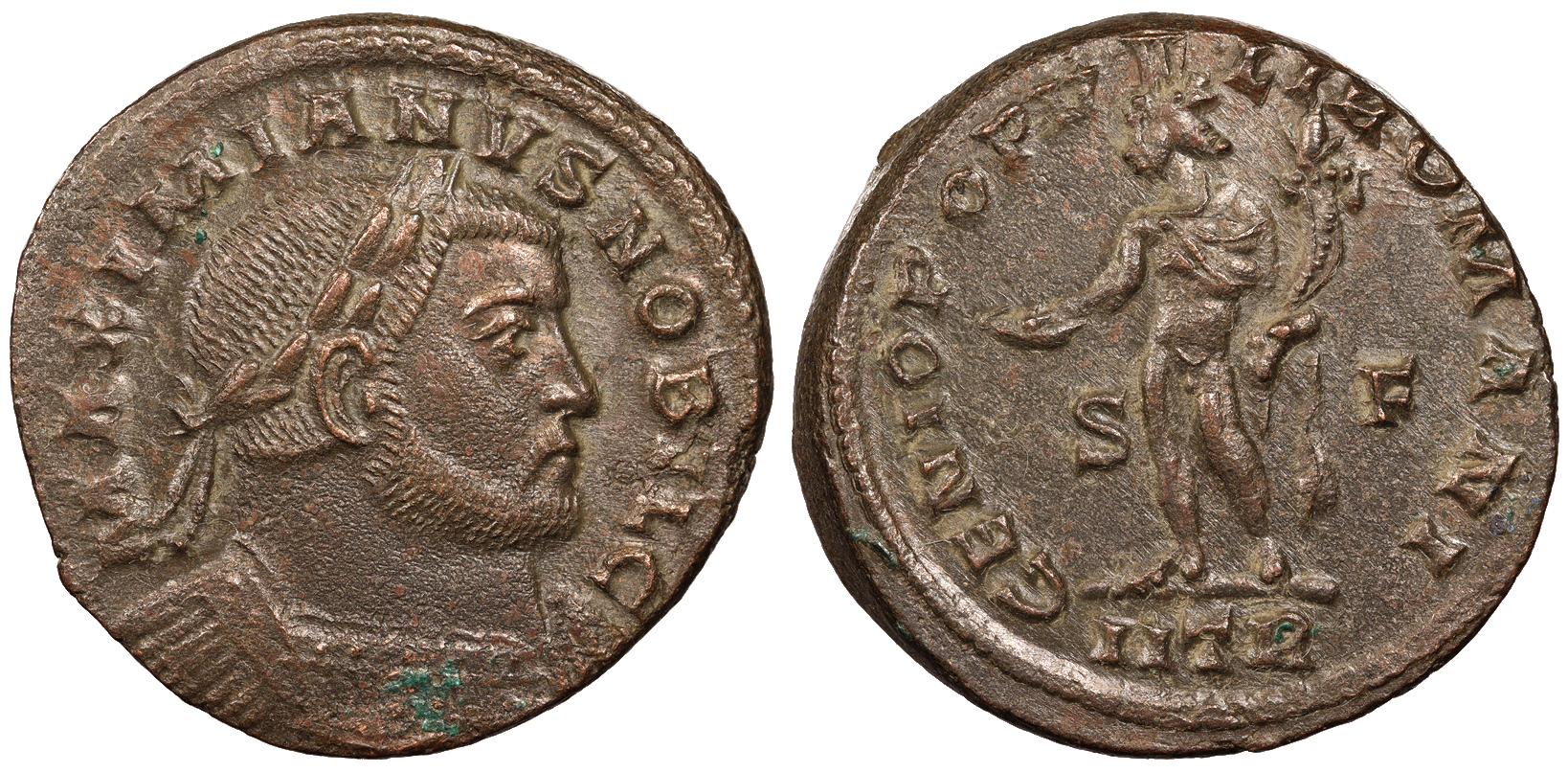 AE Follis 31mm. 8.50g. Trier Mint 302-303 A.D. Laureate and cuirassed bust, r. MAXIMIANVS NOBIL C Genius standing l., holding patera and cornucopiae; S-F across fields; In ex.: ITR GENIO POPV-LI ROMANI RIC VI 508b Good VF. Brown patina with some coppery high points. Some lightly porous spots.