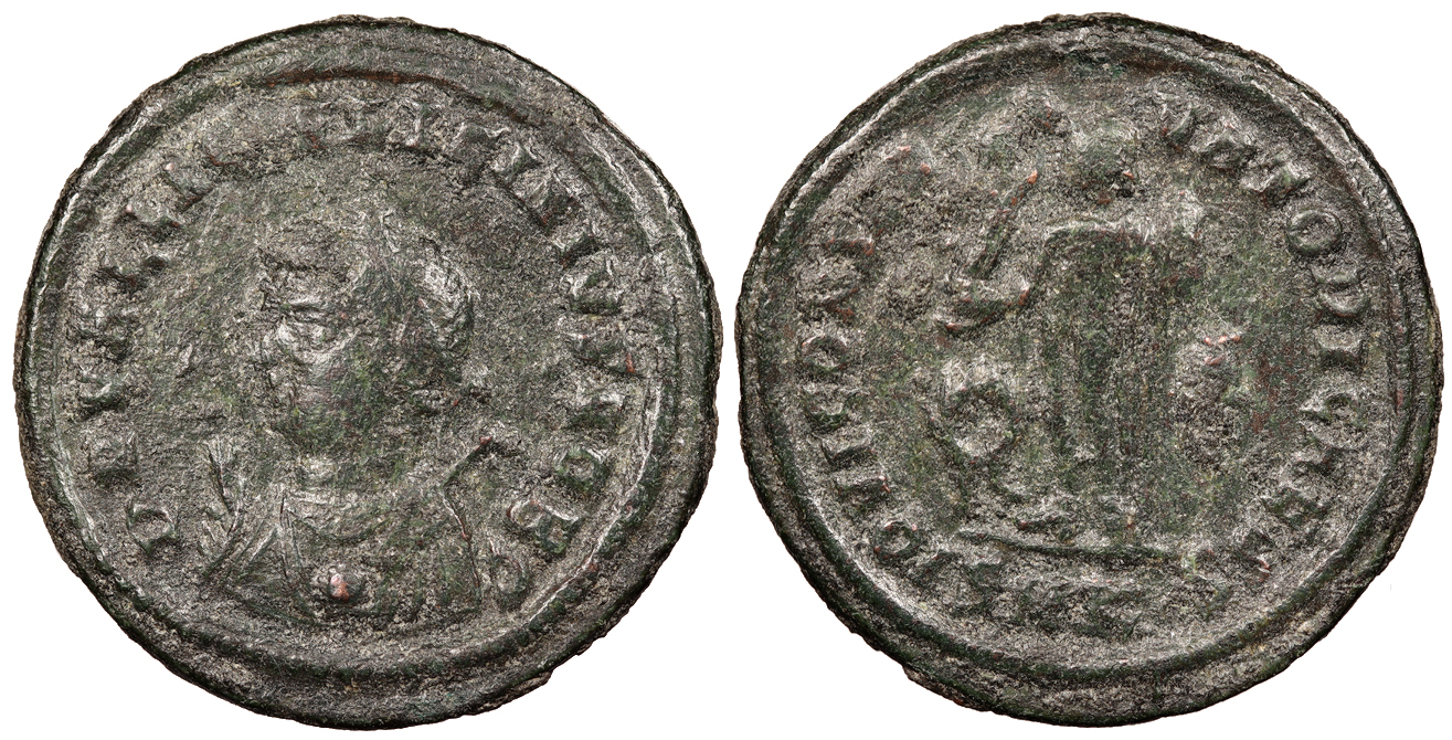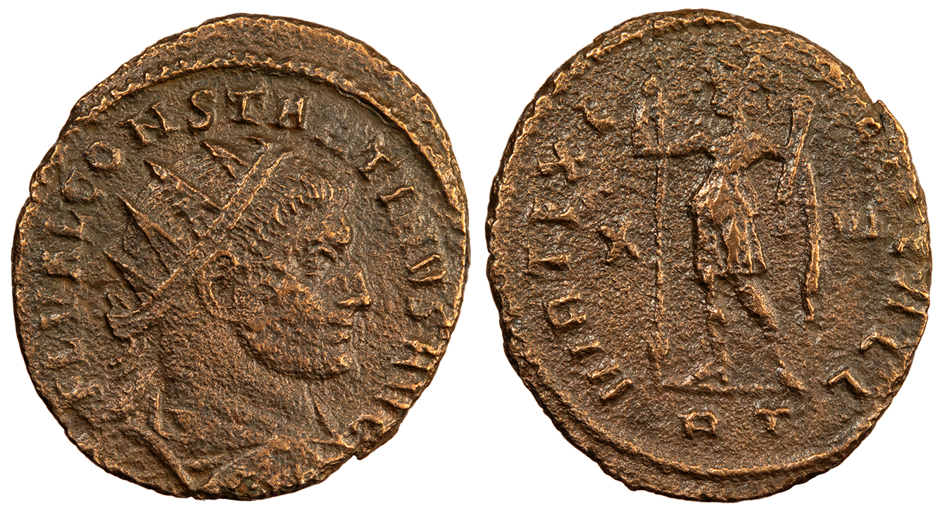 AE Half Follis 20mm. 2.56g. Rome Mint 312-313 A.D. Radiate, draped and cuirassed bust r., seen from back. FL VAL CONSTANTINVS AVG Virtus standing l., r. arm leaning on reversed spear, l. holding parazonium; X-VI across fields; In ex.: RT VIRT EXE-RCIT GALL RIC VI 360 Good VF. Quite rare. Brassy brown surfaces. Good detail despite issues. Once cleaned, now repatinating. Some porosity and roughness. A rare pre-reform radiate fraction. Reduced from: $110