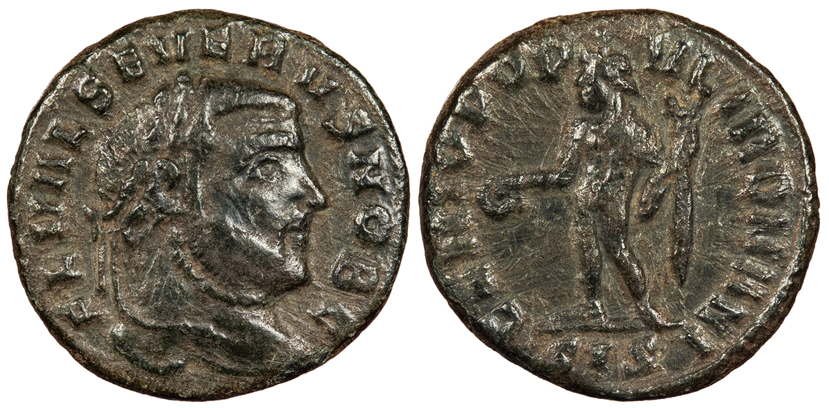 AE Quarter Follis 18mm. 2.88g. Siscia Mint 305-306 A.D. Laureate head, r. FL VAL SEVERVS NOB C Genius, modius on head, naked but for chlamys over l. shoulder, standing l., holding patera and cornucopiae; In ex.: SIS GENIO POPVLI ROMANI RIC VI 170a VF. Dark brown patina. Scarce. Tool marks, especially in reverse fields.