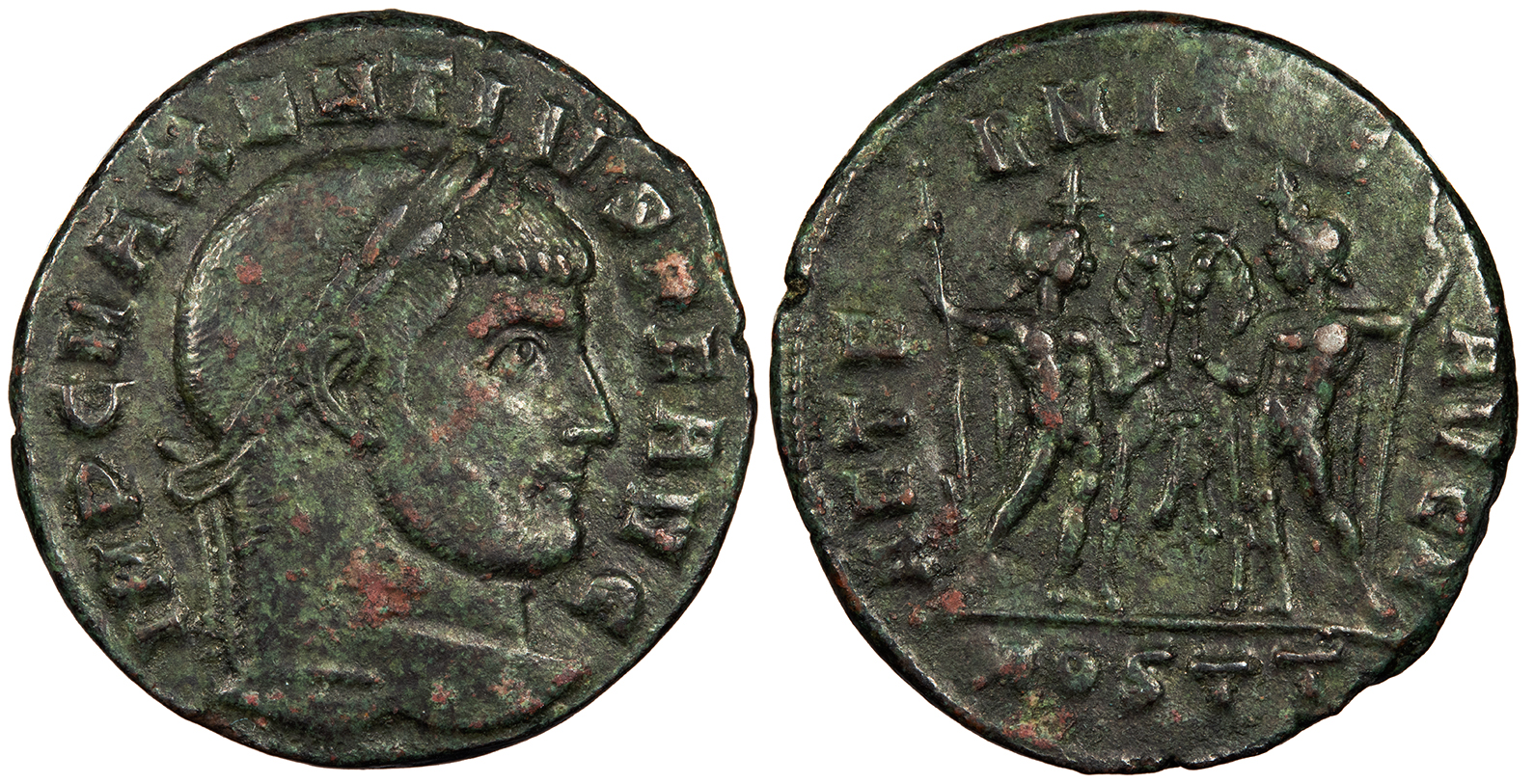 AE Follis 24mm. 6.12g. Ostia Mint 309-312 A.D. Laureate head, r. IMP C MAXENTIVS P F AVG Castor and Pollux each with star above cap, naked with chalmys over shoulder, facing each other holding sceptre and bridled horse; In ex.: MOSTT AETERNITAS AVG N RIC VI 35 VF. Dark green patina. Some minor encrustation. Some weakness in legends.