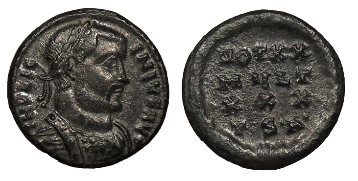 AE Follis 17mm. 2.30g. Antioch Mint 324-325 A.D. Laureate head, r.; anepigraphic.