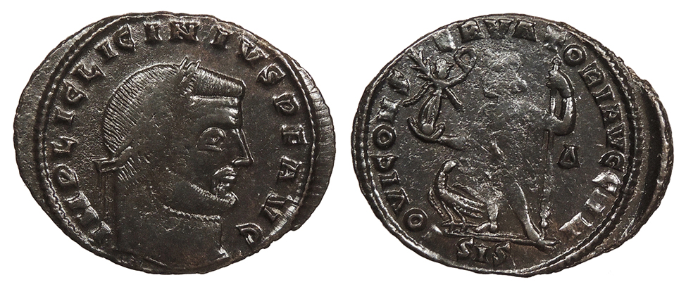 AE Follis 25mm. 3.50g. Siscia Mint 313-315 A.D. Laureate head, r. IMP LIC LICINIVS P F AVG Jupiter standing l., chlamys across l. shoulder, leaning on sceptre, Victory on globe in r. hand; eagle with wreath at feet; (delta) in r. field; In ex.: SIS IOVI CONSERVATORI AVGG NN RIC VII 4 VF. Nice chocolate-brown patina and bright, clean fields. Areas of weak strike.