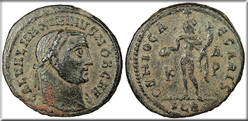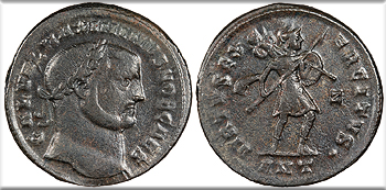 AE Follis 27mm. 6.80g. Cyzicus Mint 308-309 A.D. Laureate head, r. GAL VAL MAXIMINVS NOB C Mars advancing r. in military dress holding spear and trophy over shoulder, [gamma] in left field; In ex.: MKV VIRTVTI E-XERCITVS RIC VI 52 VF. Nice reverse detail. Pitting. Green encrustation.