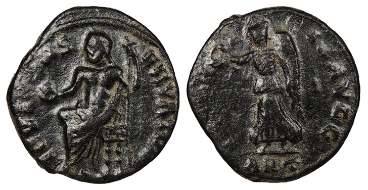 AE4 15mm. 1.70g. Antioch Mint c. 310-312 A.D. Jupiter, half-naked, seated on throne l., holding globe in r. hand and sceptre in l. IOVI CONS-ERVATORI Victory advancing l., holding crown in r. hand and palm in l.; iota (10th officina) in r. field; In ex.: ANT VICTOR-IA AVGG Van Heesch 2 VF. Glossy green-black patina with good detail for the type. Some faint cleaning marks. From the series of Christian persecution issues minted under Maximinus II Daza.