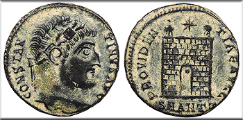 AE Follis 19mm. 2.97g. Antioch Mint 326-327 A.D. Laurel and rosette diademed head, r. CONSTAN-TINVS AVG Campgate with no doors, two turrets, star above, dot in doorway; In ex.: SMANTZ PROVIDEN-TIAE AVGG RIC VII 71 VF. Dark patina with some earthen fill. Some trace porous spots. Listed as rarity R1 in RIC.