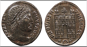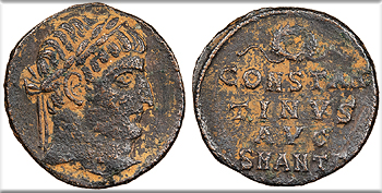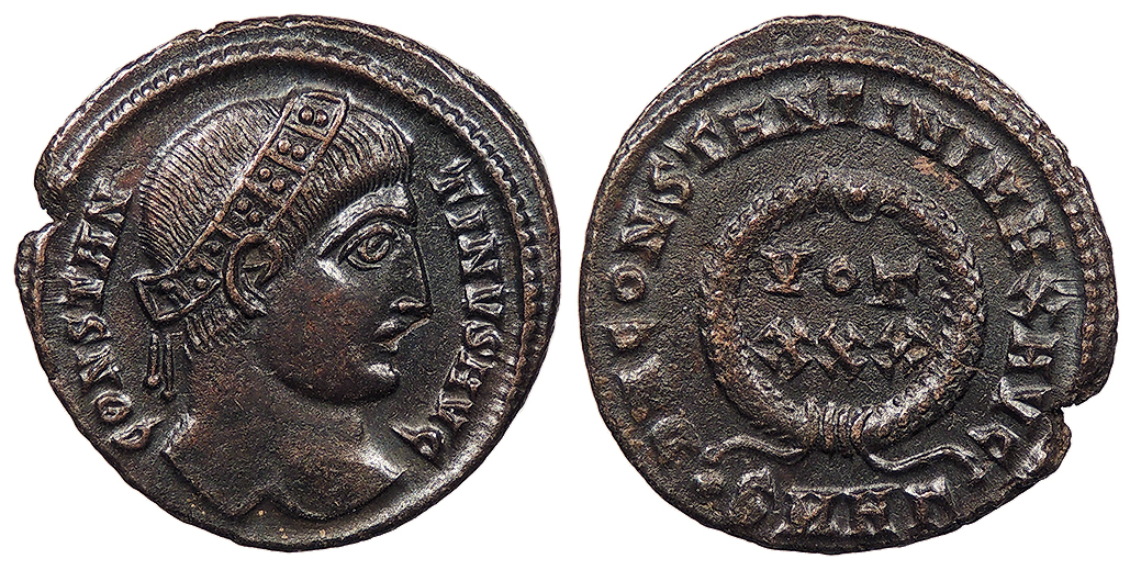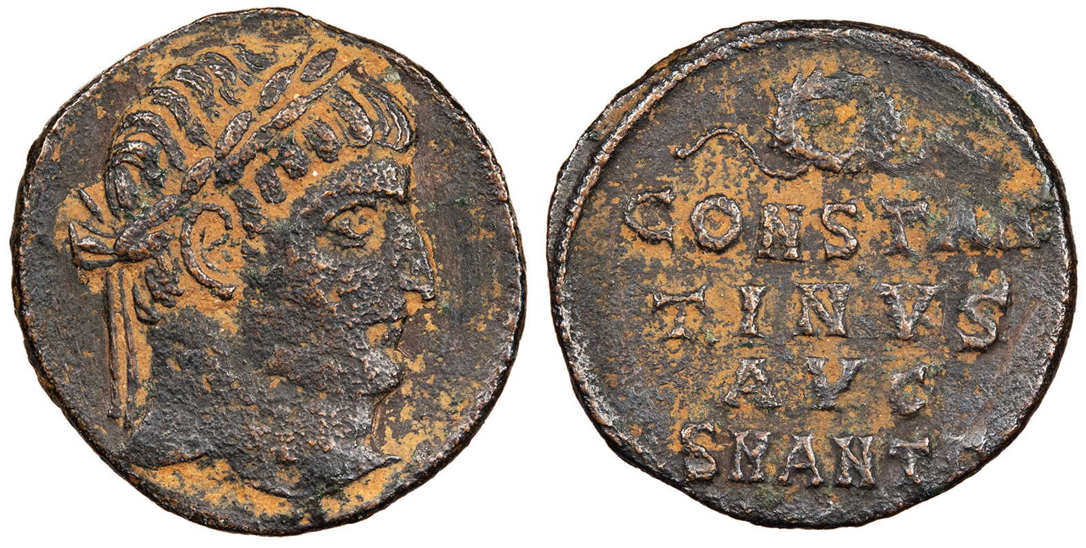 Legend in three lines, wreath above; In ex.: SMANT(gamma) above pellet. CONSTAN/TINVS/AVG RIC VII 57 VF. Dark brown patina with some reddish earthen fill. Quite scarce. Slightly rough surfaces. Listed as rarity 'R3' in RIC.