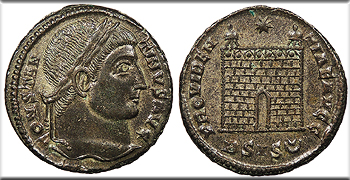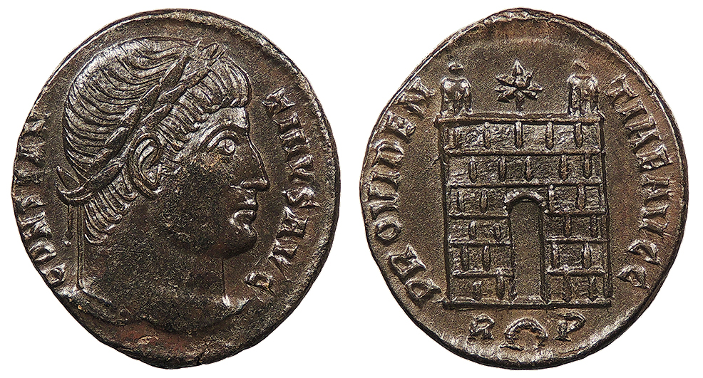 AE Follis 19mm. 2.95g. Rome Mint 326 A.D. Laureate head, r. CONSTAN-TINVS AVG Campgate with no doors, two turrets, star above; In ex.: R(wreath)P PROVIDEN-TIAE AVGG RIC VII 287 Choice EF. Glossy dark brown patina. Lustrous fields with sharp details. Essentially mint state. A hint of microporosity on cheek, otherwise gem.