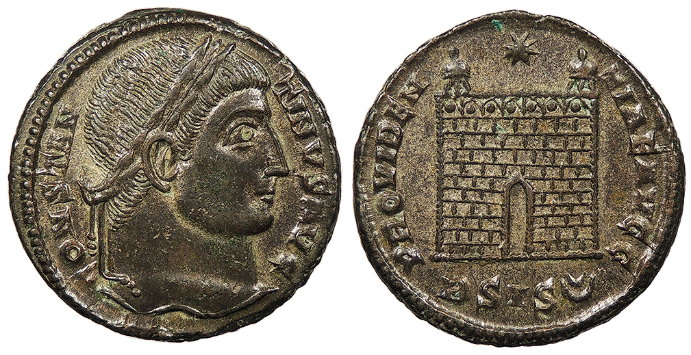 AE Follis 18mm. 3.59g. Siscia Mint 328-329 A.D. Laureate head, r. CONSTAN-TINVS AVG Campgate with no doors, two turrets, star above; In ex.: BSIS(double crescent) PROVIDEN-TIAE AVGG RIC VII 214 Choice EF. Gray patina with some remaining silvering. Choice detail and centering.