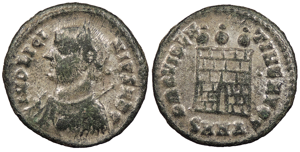 AE Follis 19mm. 3.30g. Heraclea Mint 318-320 A.D. Laureate, draped bust l., holding mappa in r. hand and sceptre and globe in l. hand. IMP LICINIVS AVG Campgate surmounted by three turrets; six stone layers; dot to r.; In ex.: SMH(delta) PROVIDENTIAE AVGG RIC VII 29 VF. Rare. Dark green patina with much lustrous silvering. A bit of a weak strike. RIC lists this type as rarity 'R5'.