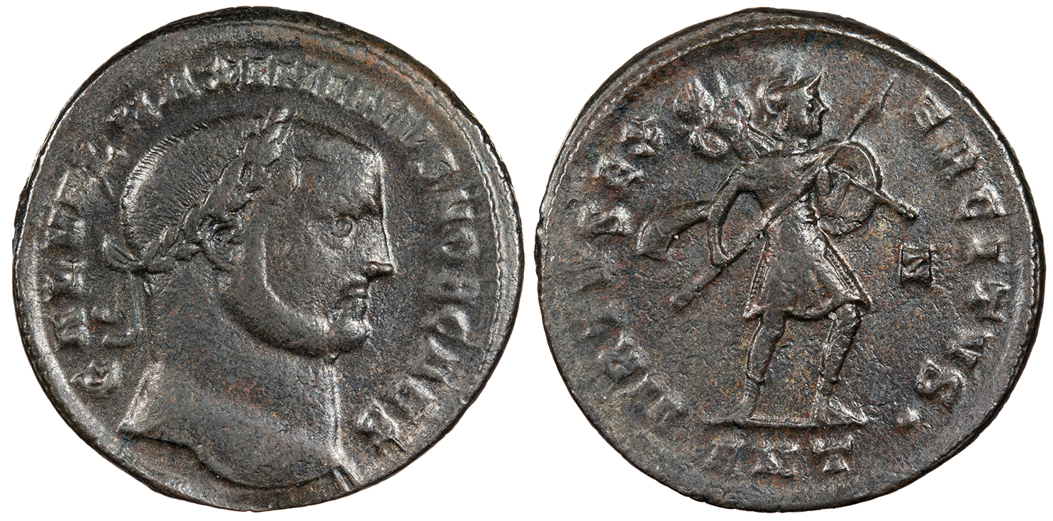 AE Follis 25mm. 6.30g. Antioch Mint 308 A.D. Laureate head, r. GAL VAL MAXIMINVS NOB CAES Virtus in military dress, advancing r., holding transverse spear, shield and trophy; Z in r. field; In ex.: ANT· VIRTVS EXERCITVS RIC VI 93 VF. Dark brown patina. Struck with worn dies.
