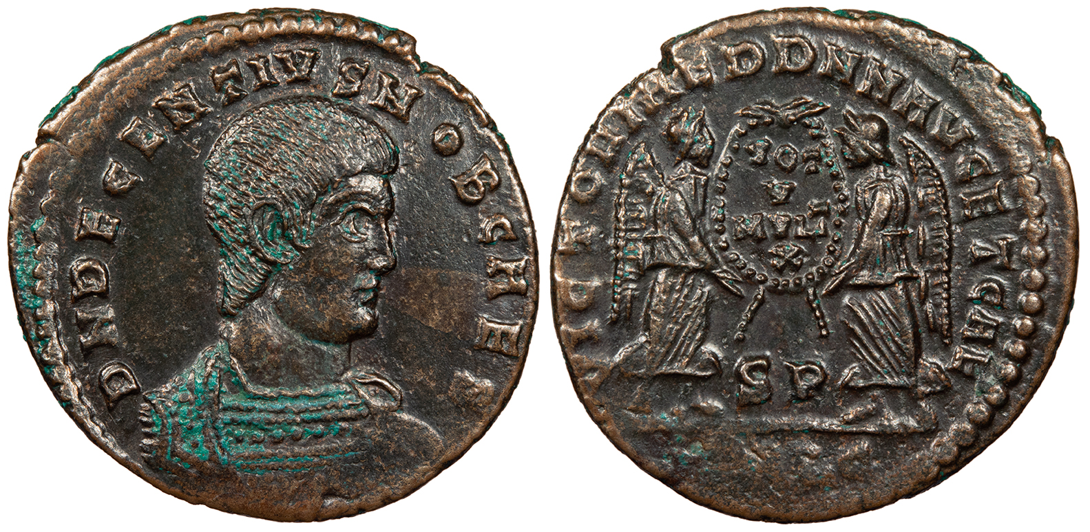 AE Follis 22mm. 5.10g. Trier Mint Draped and cuirassed bust, r.; A behind head. D N MAGNEN-TIVS P F AVG Two victories standing facing each other, holding shield inscribed VOT / V / MVLT / X; In ex.: TRS VICTORIAE DD NN AVG ET CAES RIC VIII 306 Good VF. Dark brown patina. Moderate green encrustation.