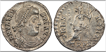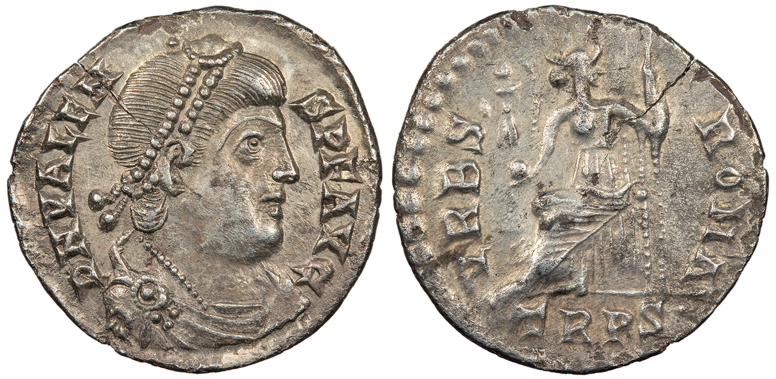 AR Siliqua 18mm. 2.11g. Trier Mint 375-378 A.D. Pearl-diademed, draped and cuirassed bust, r. D N VALEN-S P F AVG Roma seated l. on throne, holding Victory on globe in r. hand and inverted spear in l.; In ex.: TRPS. VRBS ROMA RIC 27a EF. Toned and lustrous. Sharp portrait. Flan crack. Some areas of light porosity. Possibly crystallized.