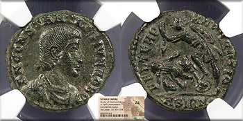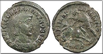 AE Follis 22mm. 5.92g. Siscia Mint 350 A.D. Pearl-diademed, draped and cuirassed bust, r.; A behind, star before. D N CONSTAN-TIVS P F AVG Emperor in military dress standing facing, head l., standard with Chi-Rho in each hand; star above; A in l. field; In ex.: .(gamma)SIS. CONCORDIA MILITVM RIC VIII 284 EF. Gray patina with some lustre near edges. Some flan irregularities. Some coppery spots on reverse.