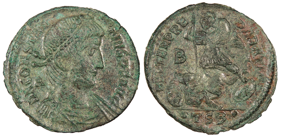 AE2 24mm. 4.90g. Thessalonica Mint 350 A.D. Pearl-diademed, draped and cuirassed bust r.; A behind bust. D N CONSTAN-TIVS P F AVG Helmeted soldier advancing l., spearing fallen horseman wearing pointed cap and turning to face soldier, hands raised; B in l. field, star in r.; In ex.: ˇTSBˇ FEL TEMP RE-PARATIO RIC VIII 134 Good VF. Green patina with much silvering remaining. Light roughness.